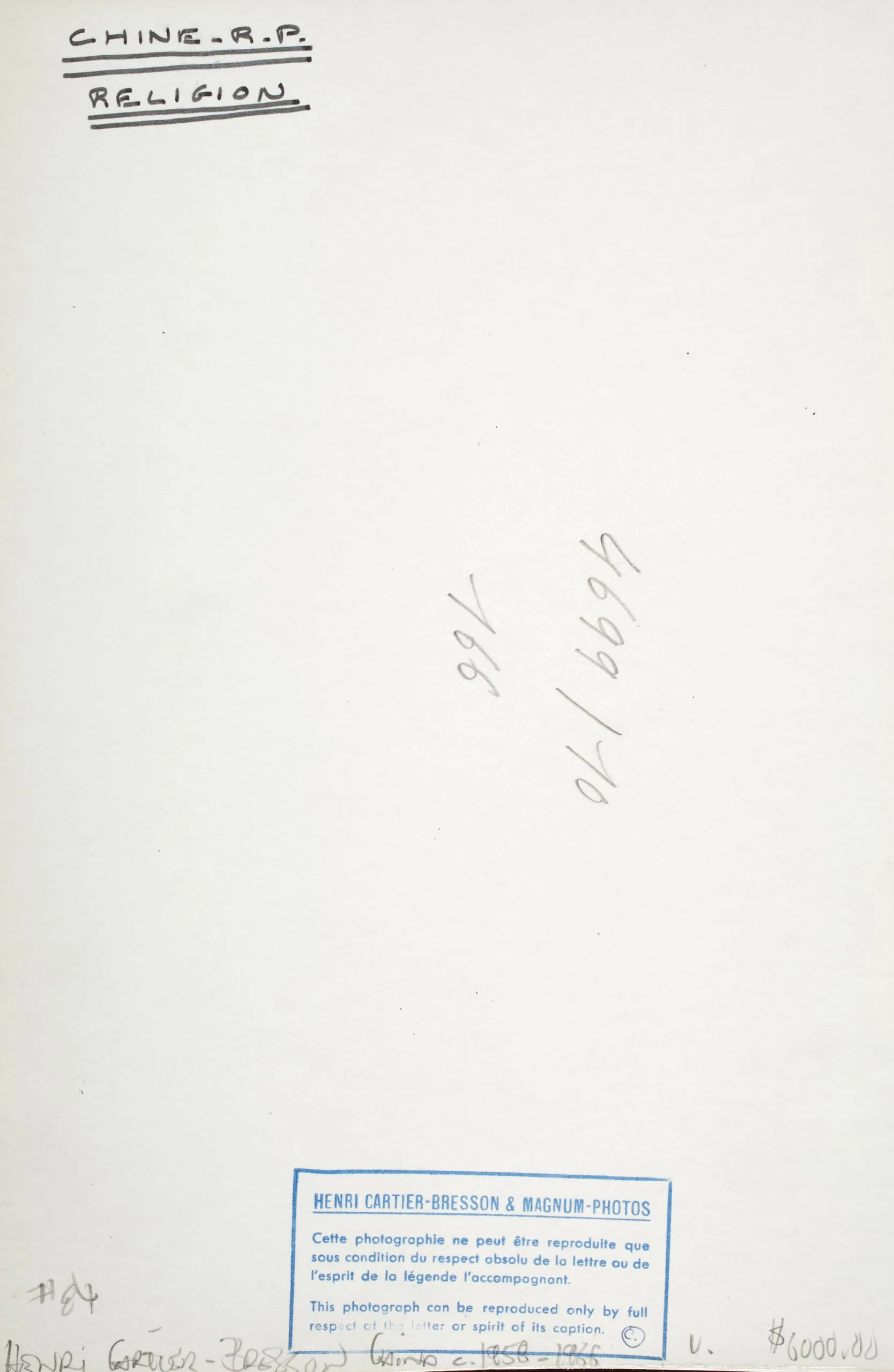 Verso of a photograph print with handwritten annotations, a Magnum Photos reproduction stamp in blue ink at lower center, and penciled numbers near the middle.