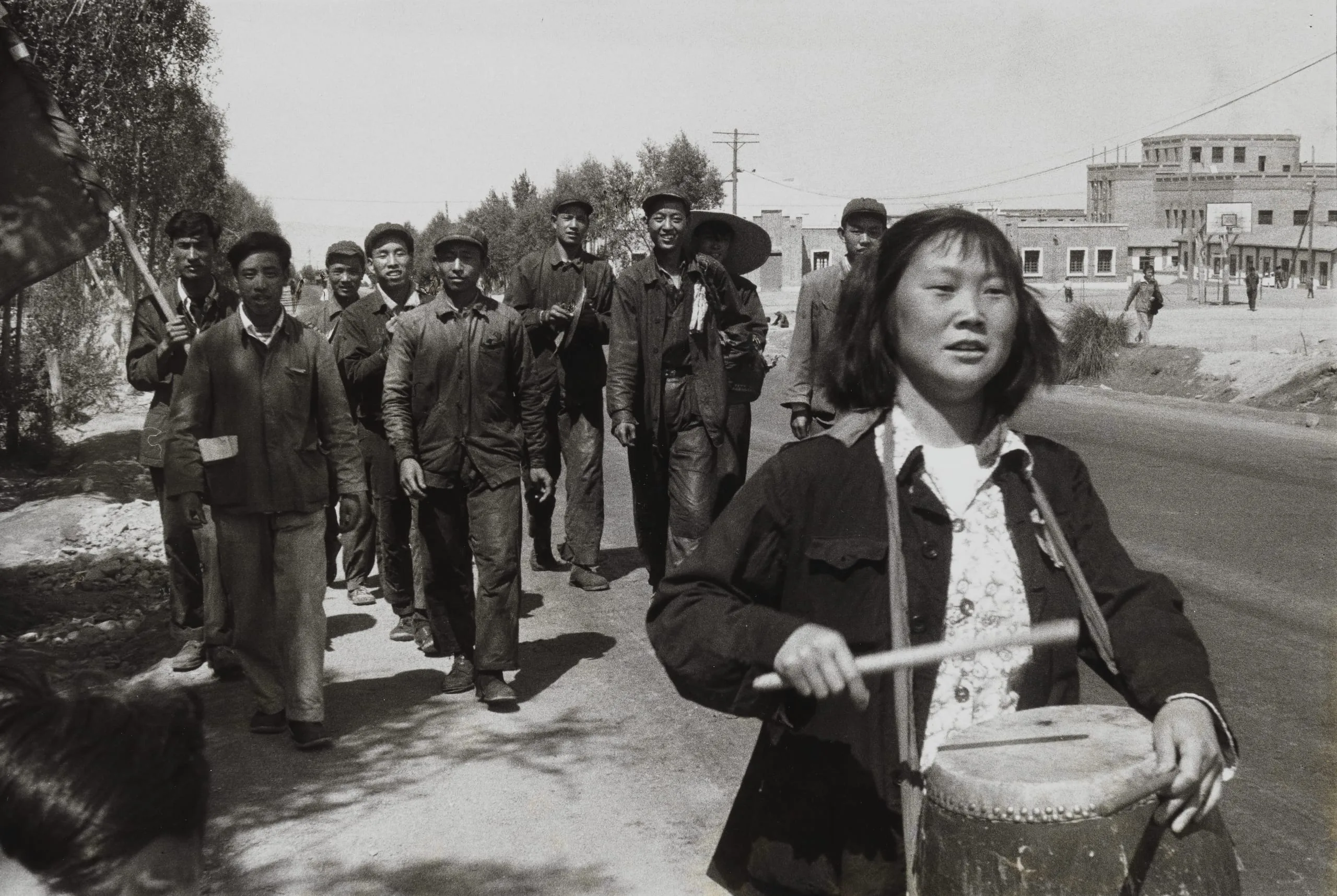 Black and white photograph of a woman beating a drum leading a column of marchers along a sunlit road, with trees and a brick building in the distance