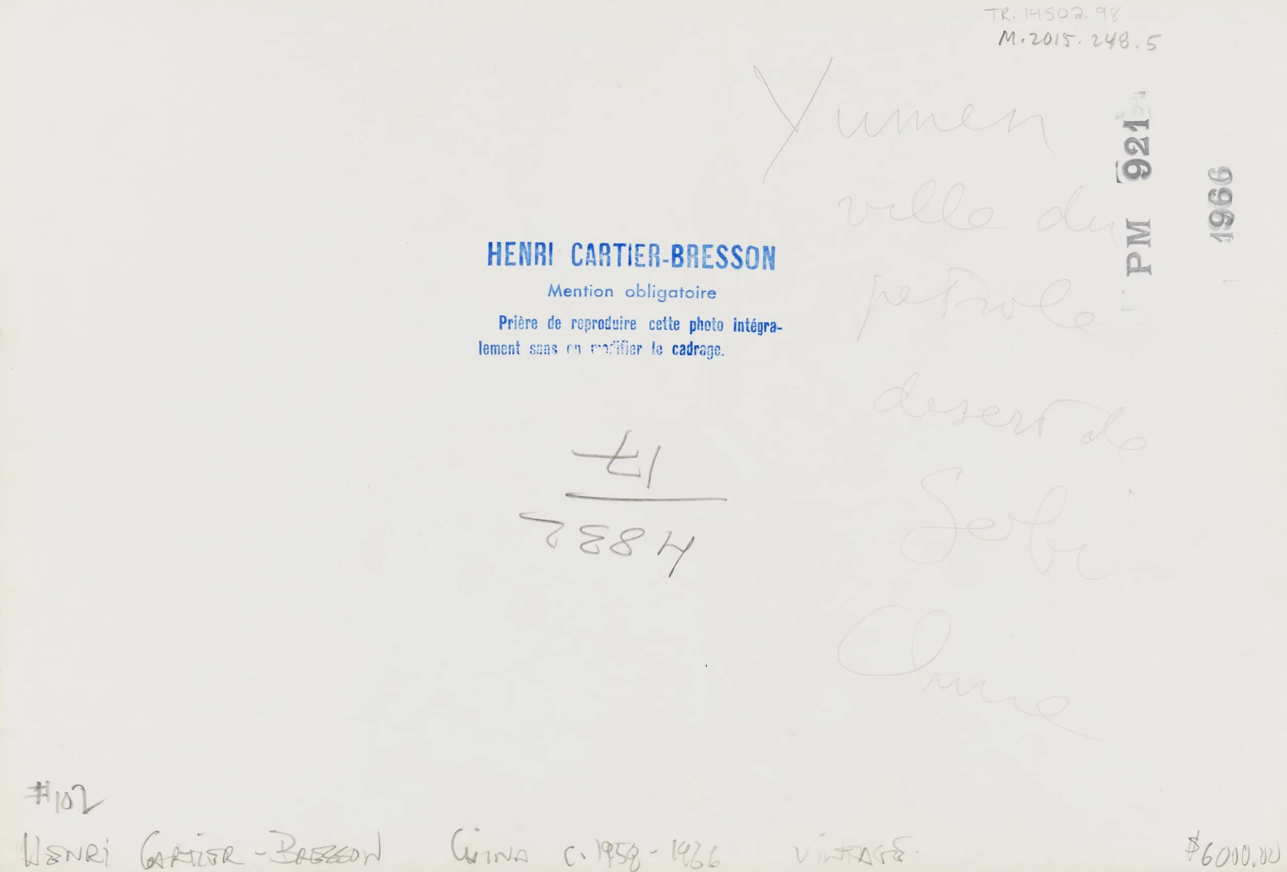 Verso of a photograph print showing a printed blue studio credit label, handwritten pencil annotations, stamped numbers, and inscriptions in French and English on white paper stock.
