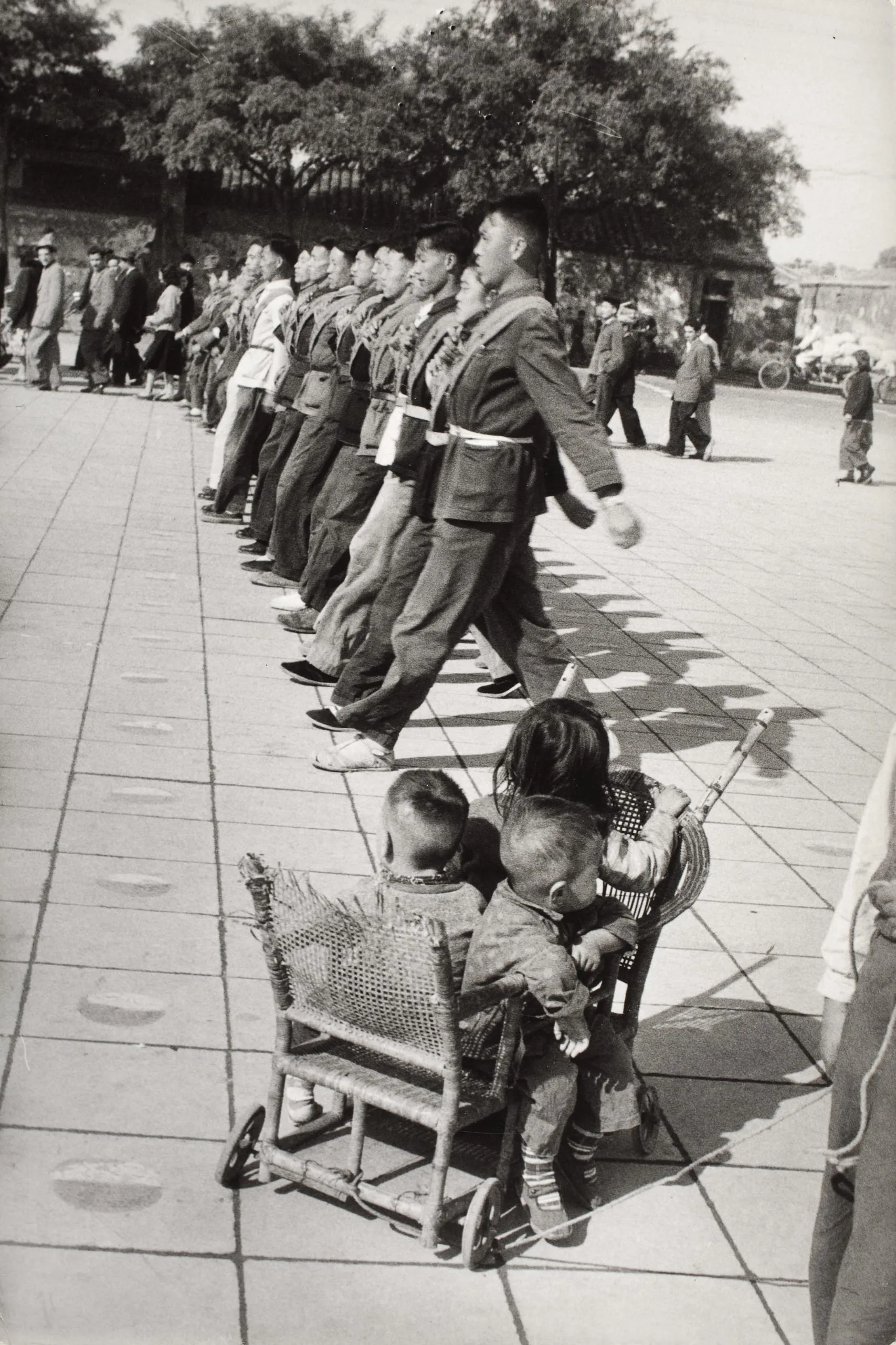 Black and white photograph of a column of uniformed soldiers marching across a wide plaza, with two young children seated in wicker chairs in the foreground watching the procession