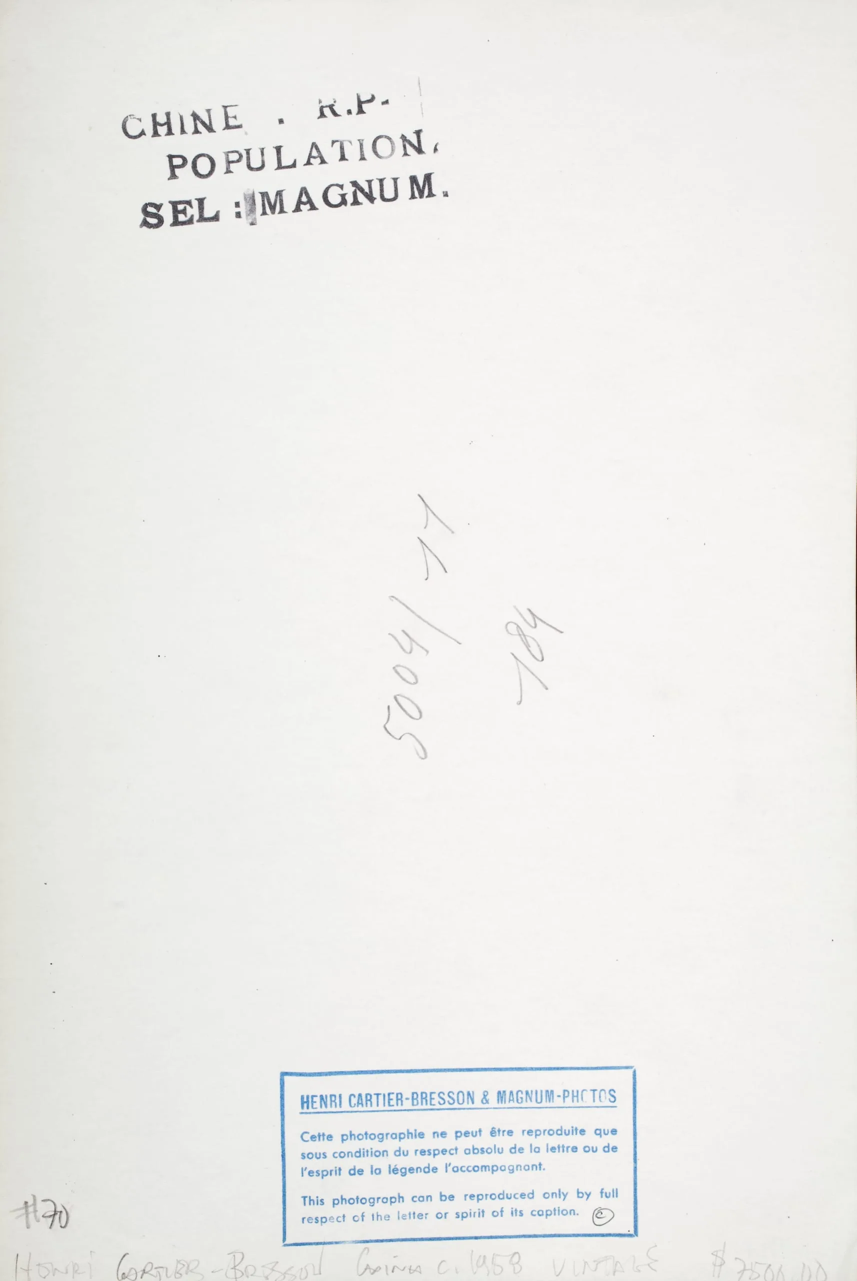 Verso of a gelatin silver print showing stamps, handwritten notations, and a printed Henri Cartier-Bresson & Magnum-Photos copyright label in French and English.