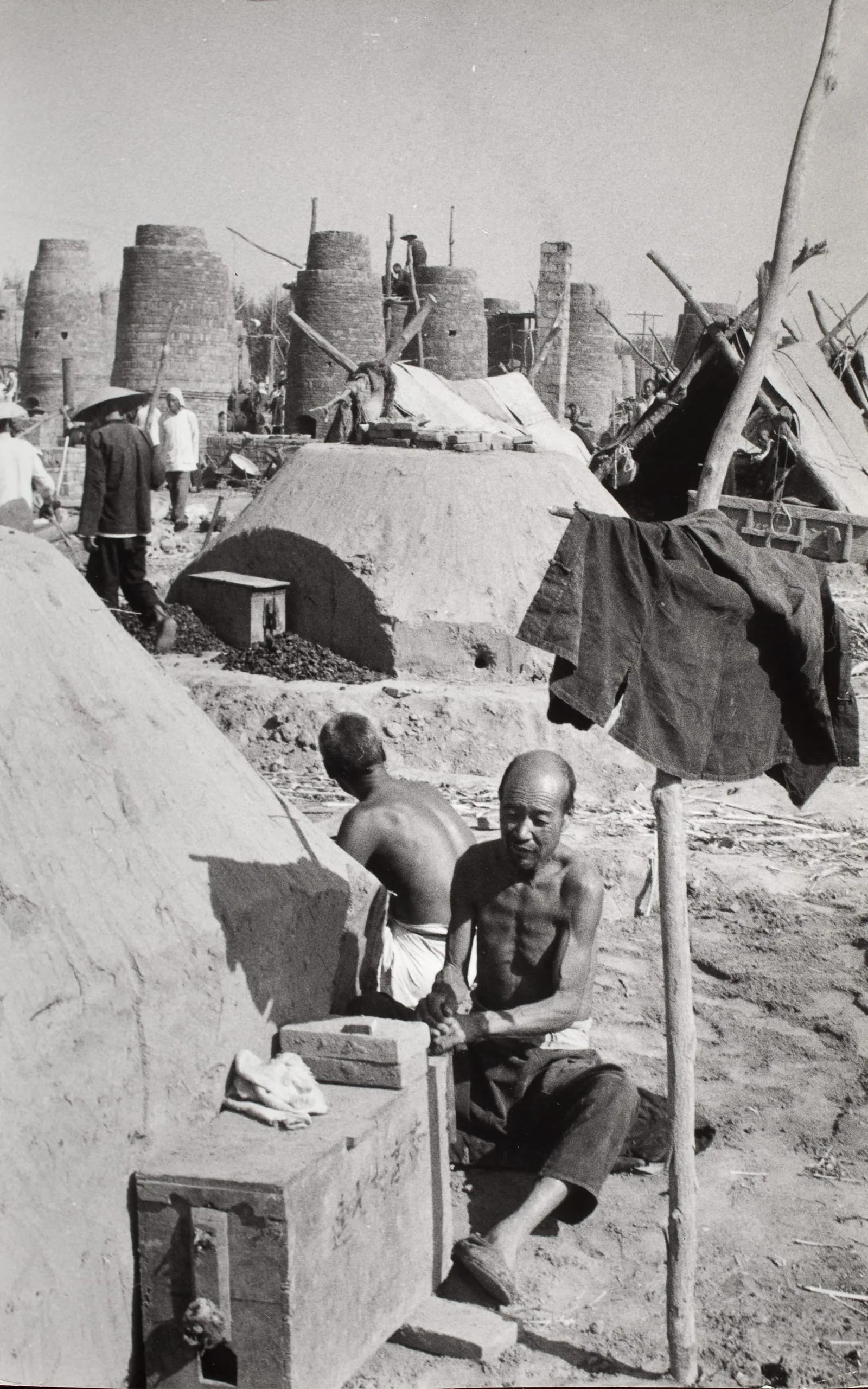 Black and white photograph of two shirtless men sitting in a trench at an outdoor brick kiln yard, with dome-shaped earthen mounds and tall cylindrical kilns in the distance