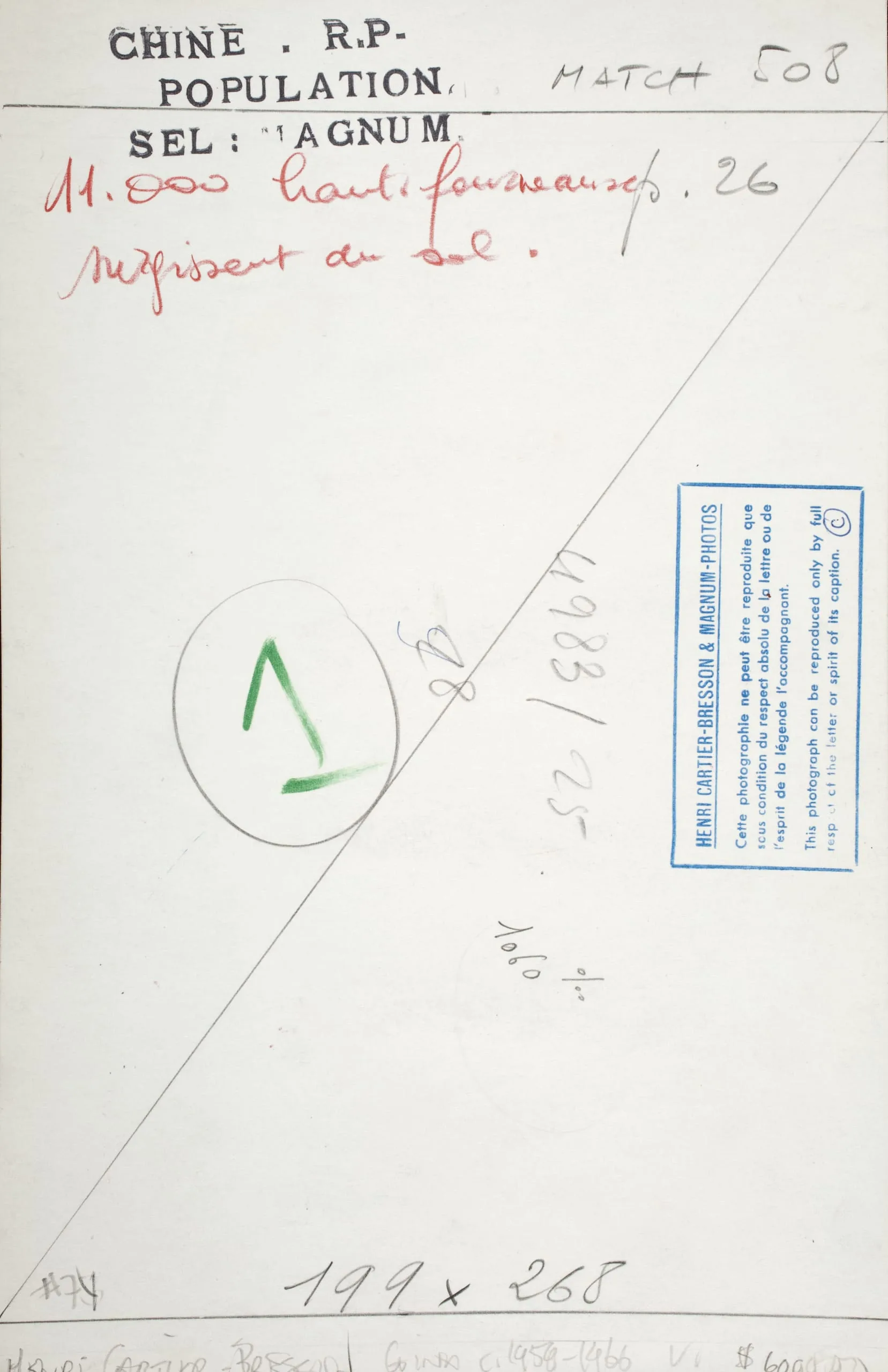 Verso of a photograph print with handwritten annotations in French and red ink, a green pencil mark within a drawn circle, a diagonal crop line, and a Henri Cartier-Bresson & Magnum Photos copyright stamp