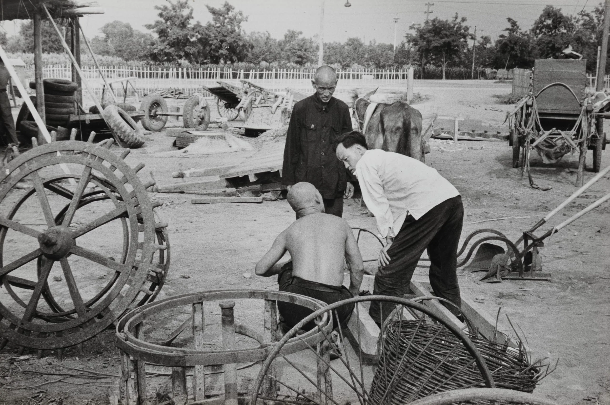 Black and white photograph of three men working with metal rims and cart parts in an outdoor yard, surrounded by wooden wheels, tires, and a draft animal in the background