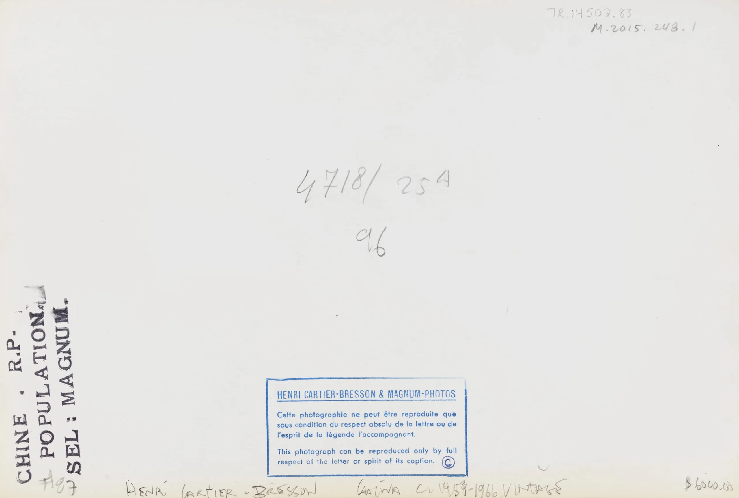 Verso of a gelatin silver print showing stamps, handwritten notations, accession numbers, and a blue Magnum Photos copyright label with French and English text.