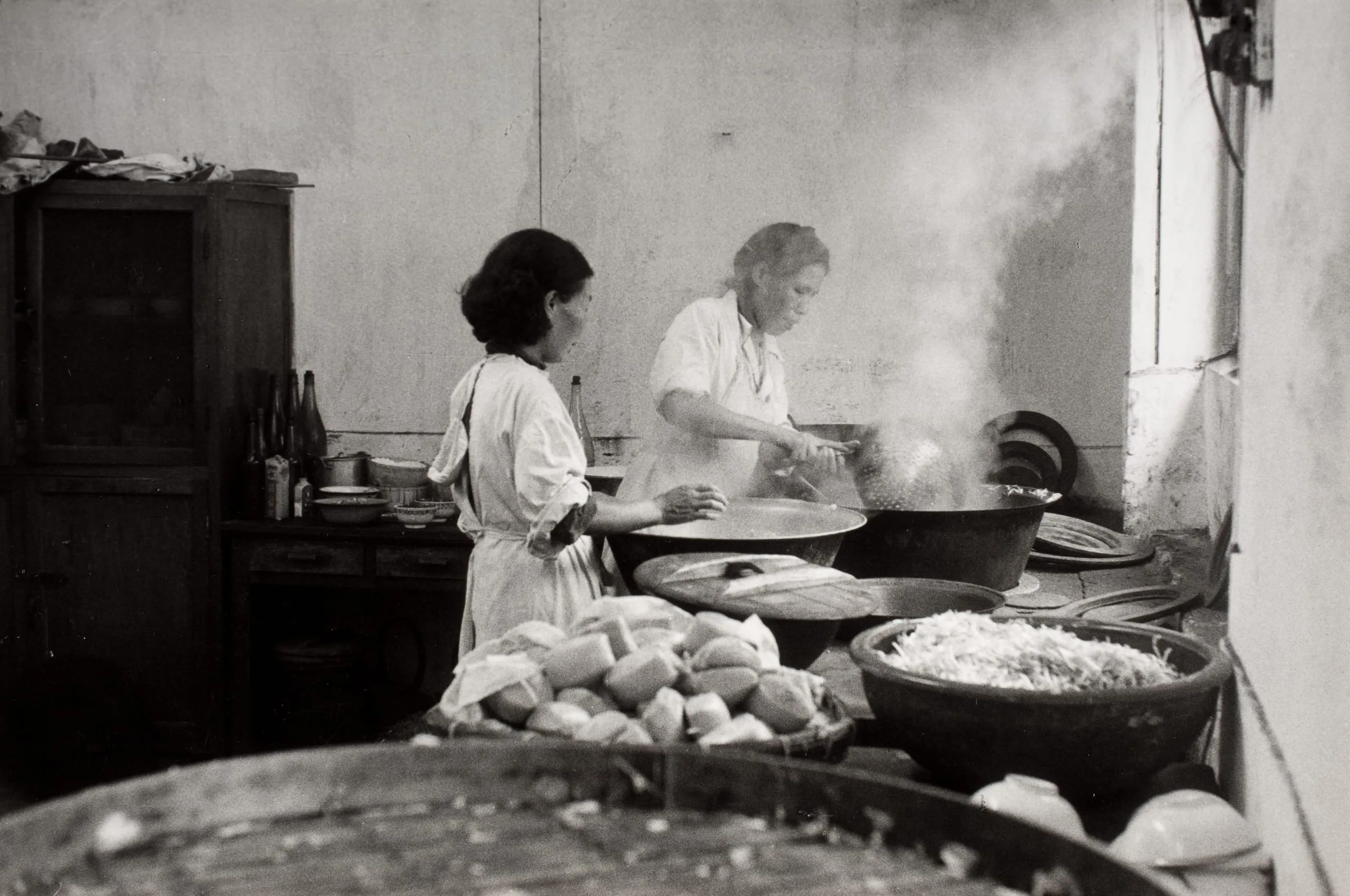 Black and white photograph of two people cooking in a kitchen, leaning over large woks with steam rising, surrounded by bowls of ingredients