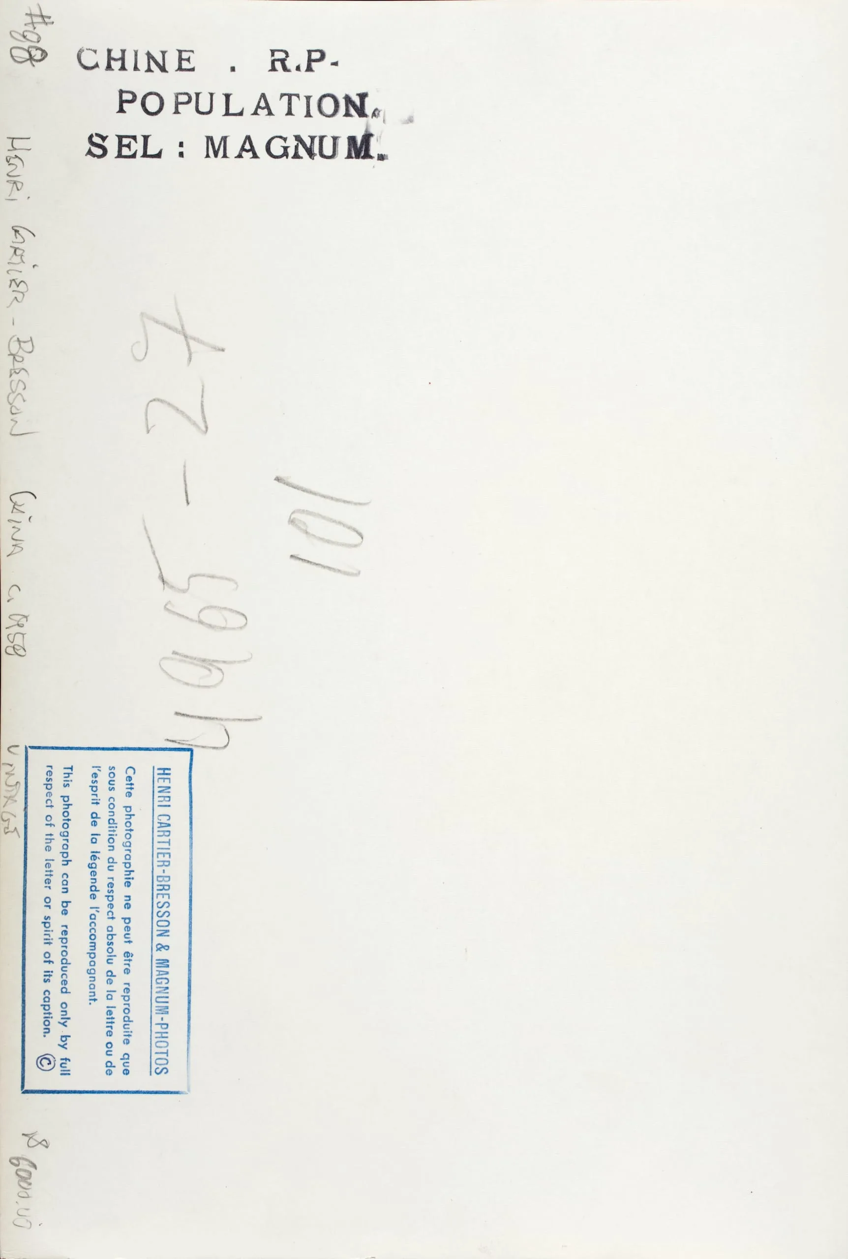 Verso of a photograph print with typed annotations, handwritten catalog numbers, and a blue Magnum Photos copyright stamp.