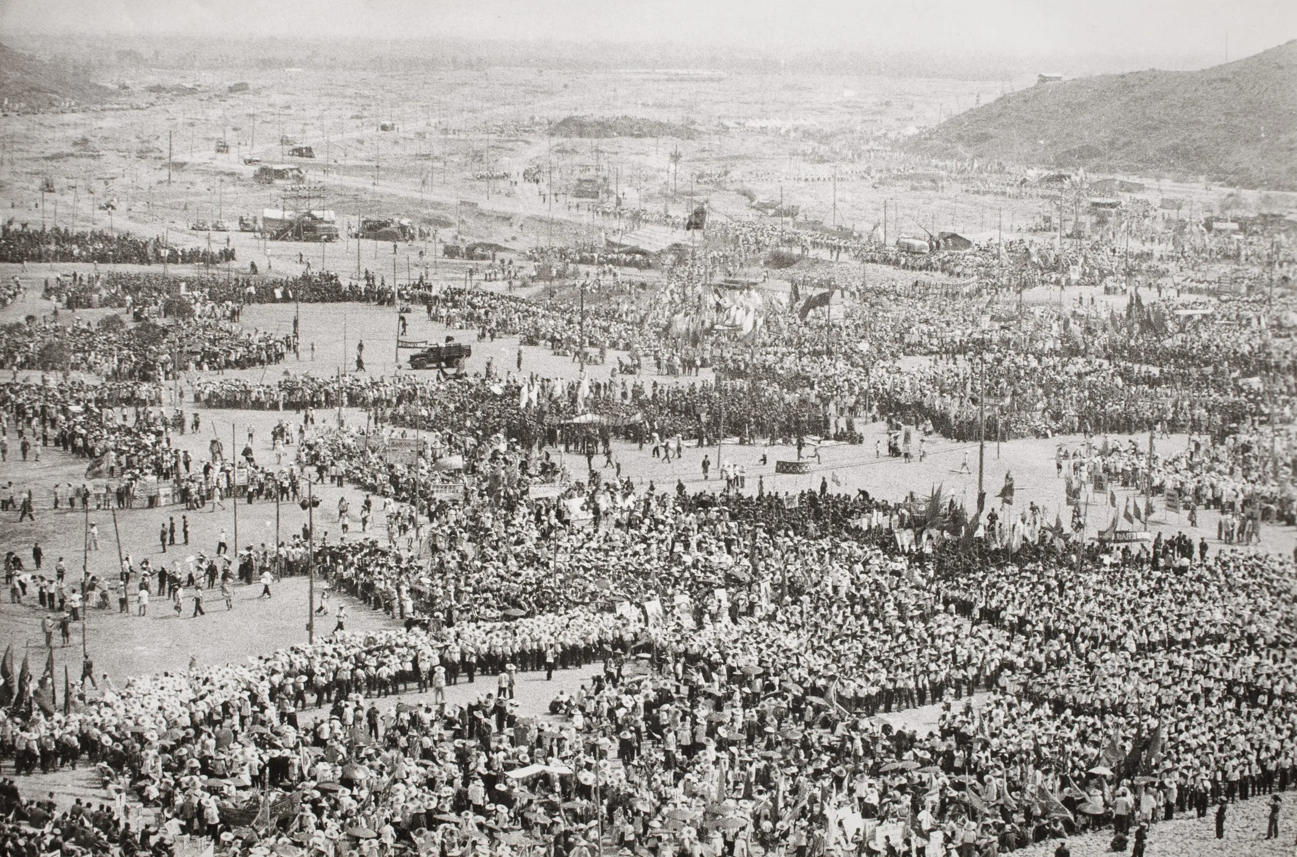 Black and white aerial photograph of a vast outdoor gathering with thousands of people arranged in dense formations across a wide open plain, with hills and a hazy cityscape in the distance