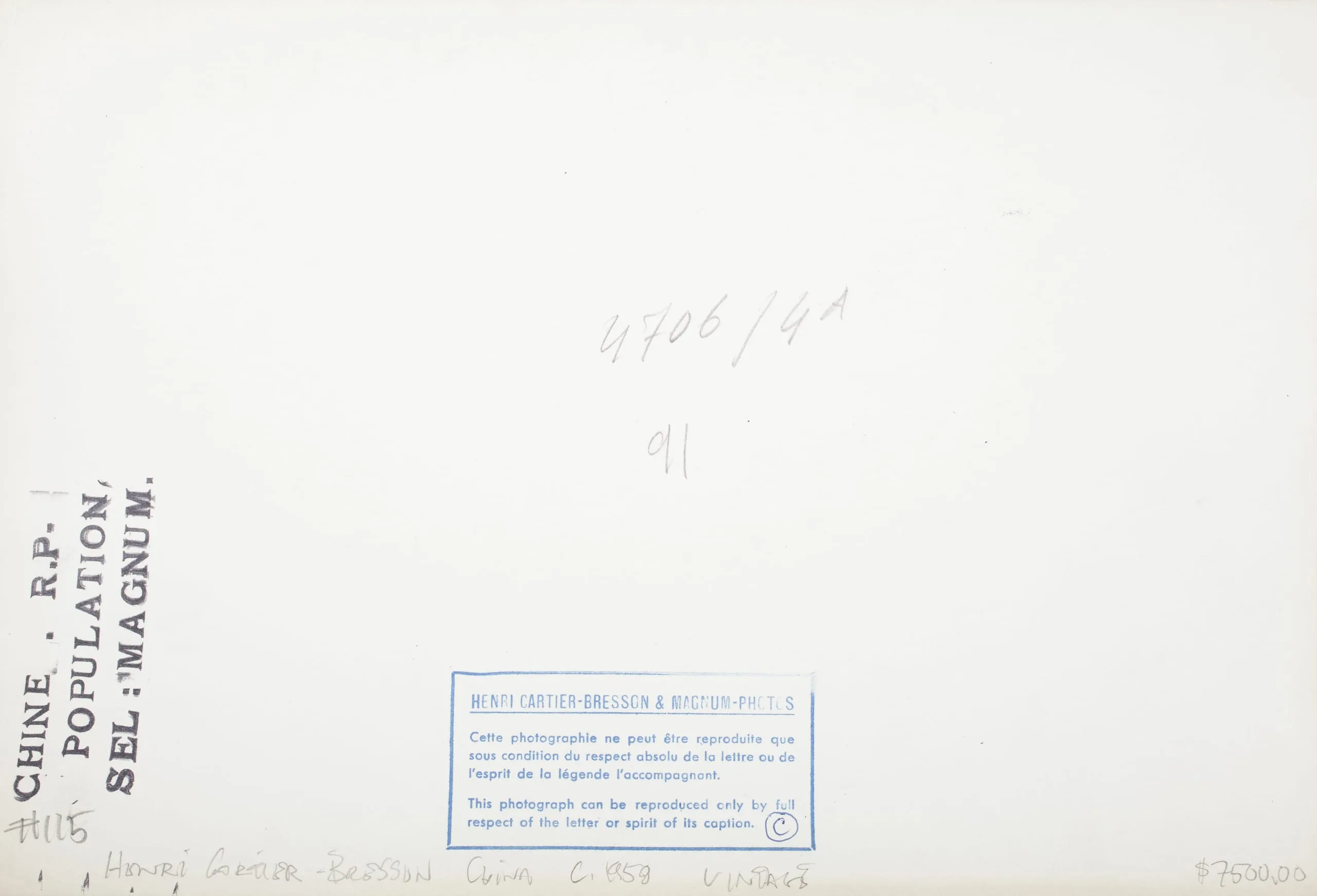 Verso of a gelatin silver print showing handwritten annotations, rubber stamps reading "CHINE. R.P., POPULATION, SEL.: MAGNUM," a blue Magnum Photos reproduction rights stamp in French and English, and penciled numbers.