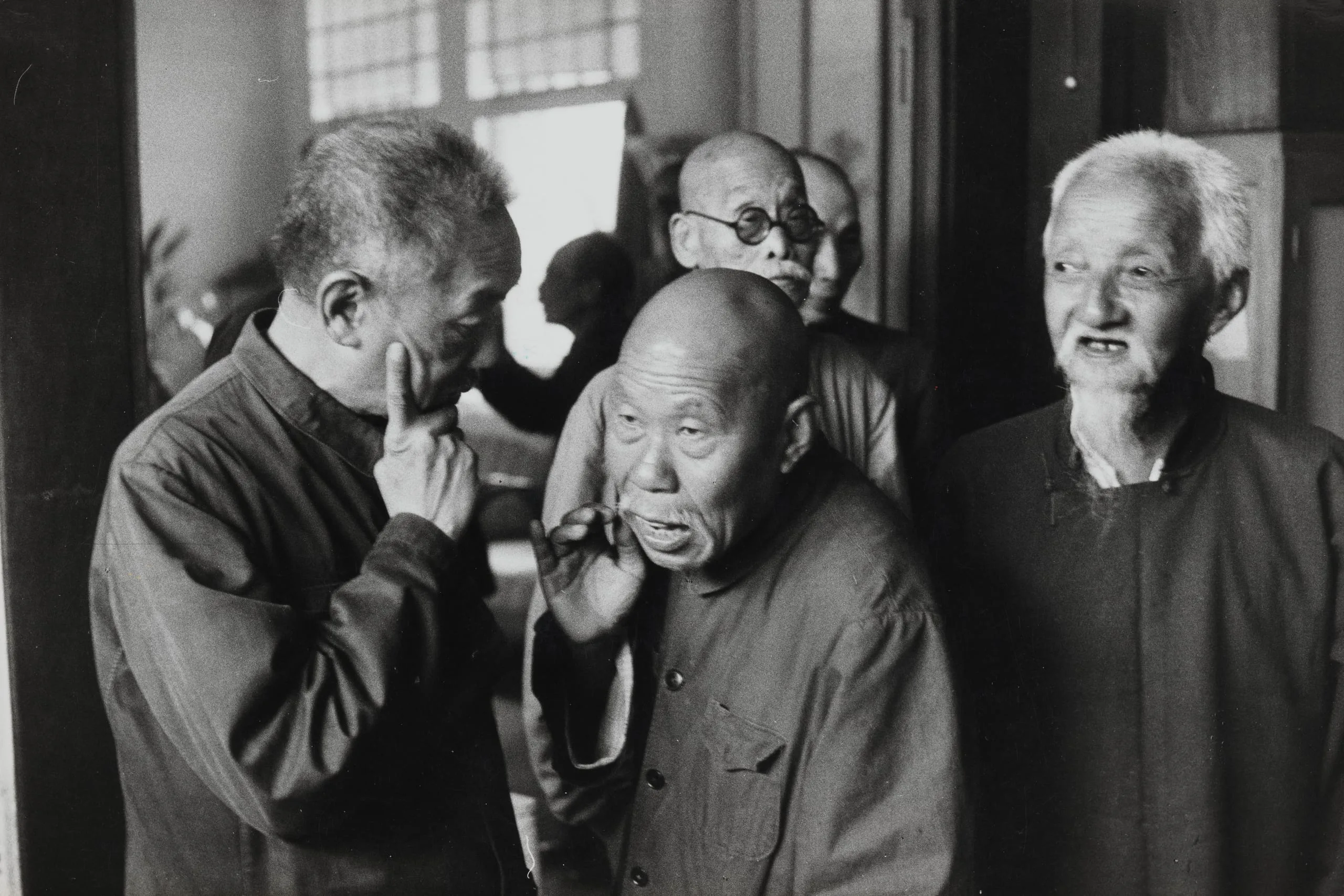 Black and white photograph of four elderly men in dark collarless jackets gathered indoors, one speaking with a raised finger, soft window light behind them