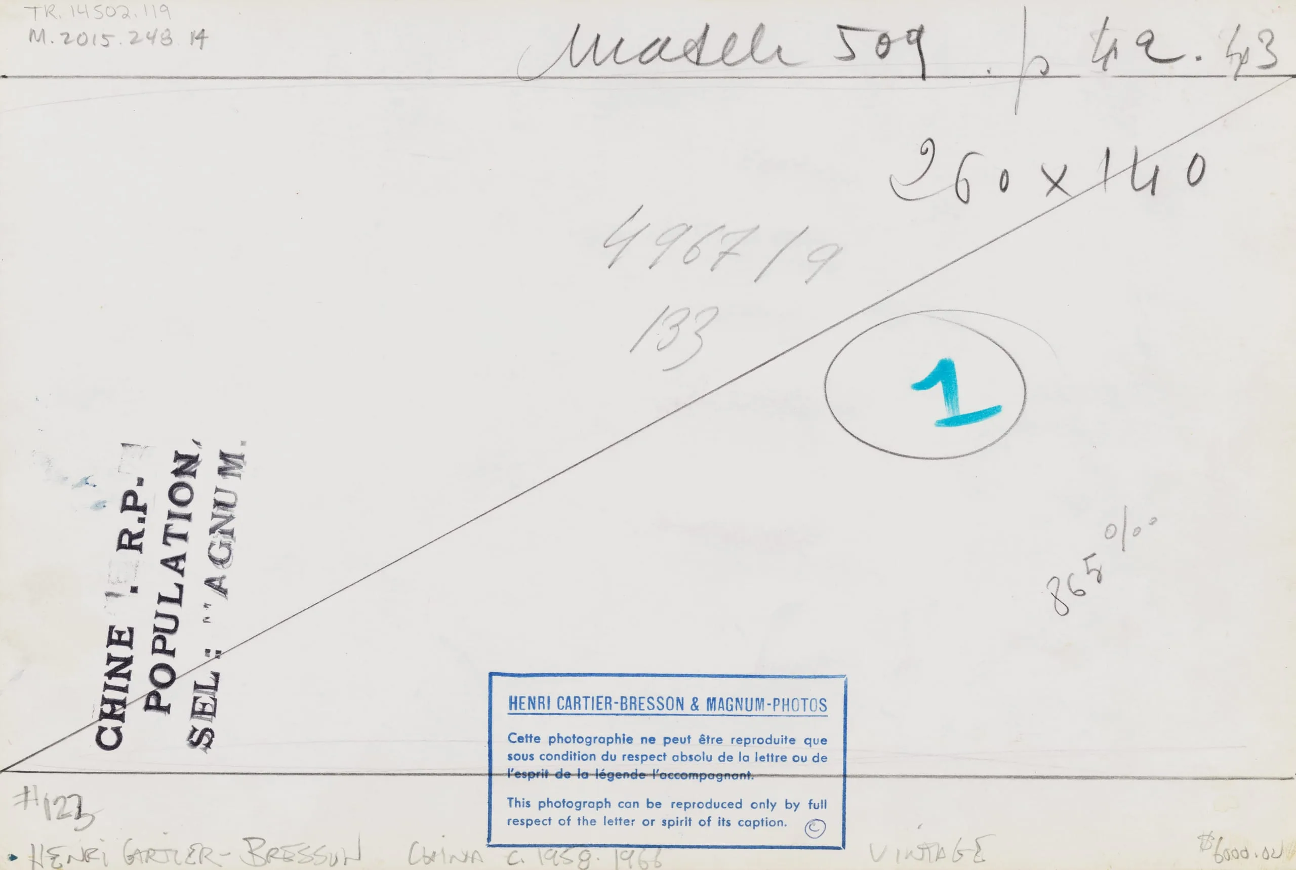 Verso of a photograph: white card with handwritten annotations, crop marks, and a blue Magnum Photos copyright stamp in French and English. A diagonal line crosses the surface, with a circled teal numeral "1" at right.