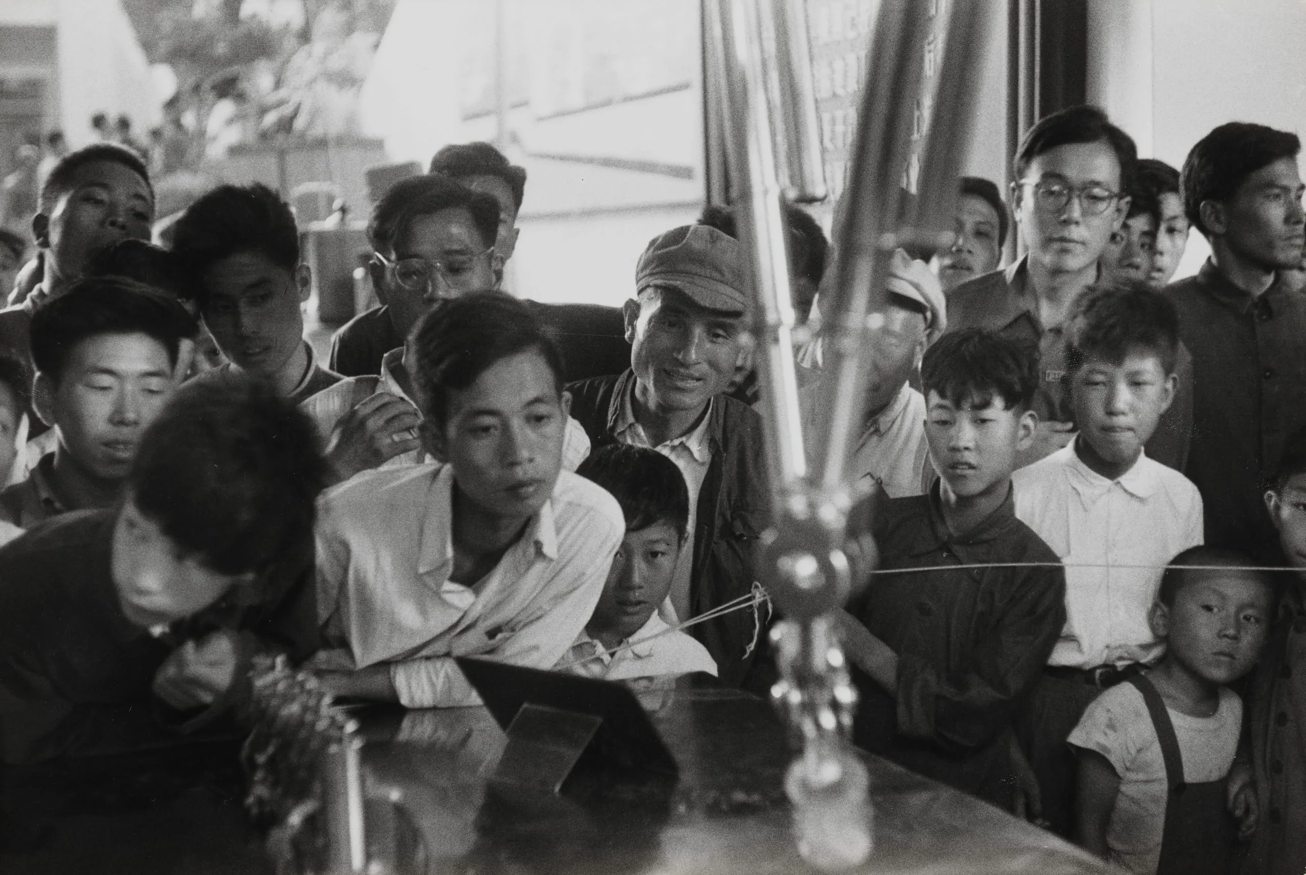 Black and white photograph of a dense crowd of men, women, and children leaning over a counter to look at an object, mid-twentieth century