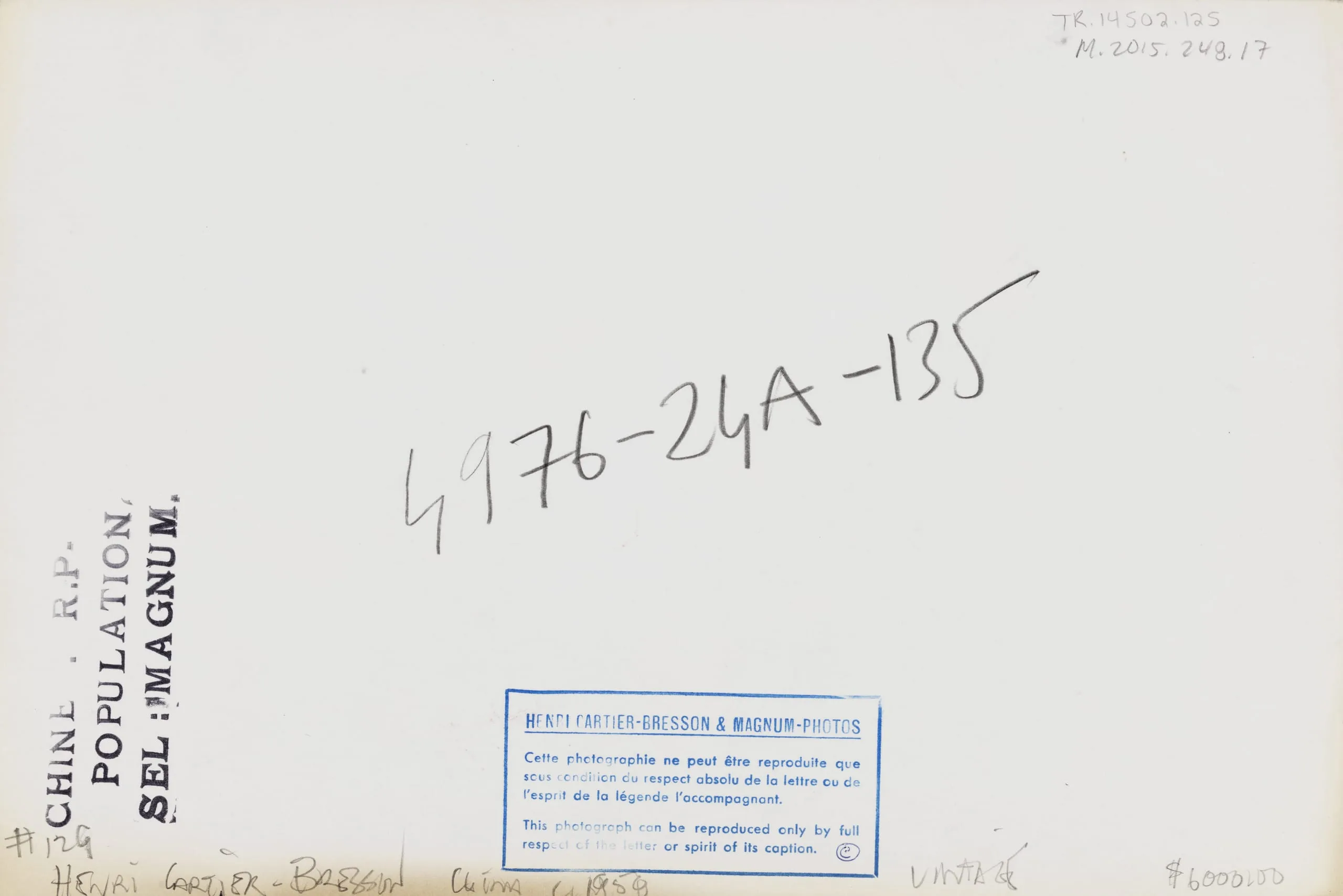 Verso of a gelatin silver print, showing handwritten annotation "4976-24A-135", a printed Magnum Photos copyright stamp, and penciled inscriptions in French and English along the bottom edge.
