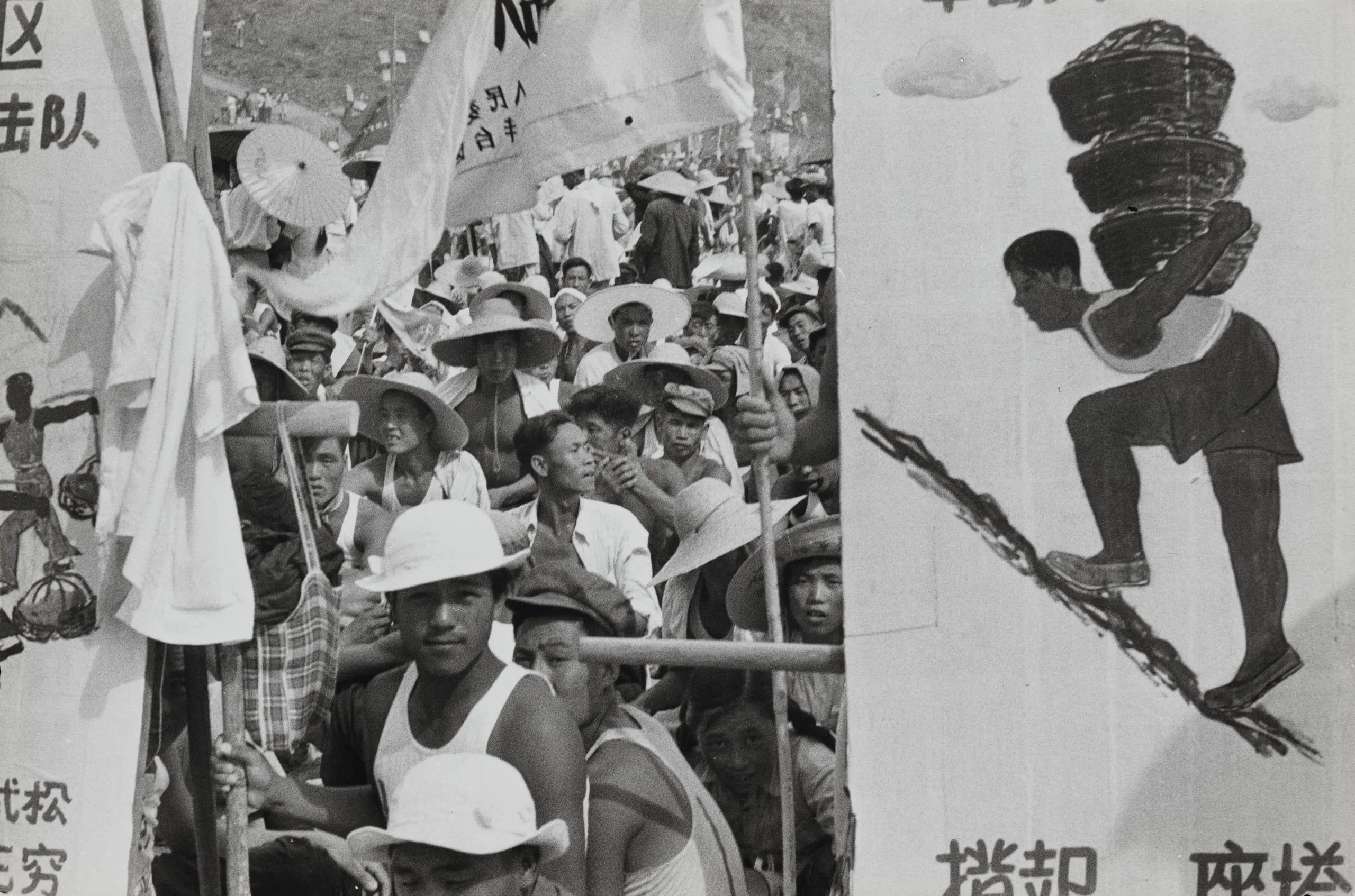 Black and white photograph of a large crowd of men in straw hats holding banners with Chinese characters, beside a illustrated poster of a figure climbing with heavy baskets
