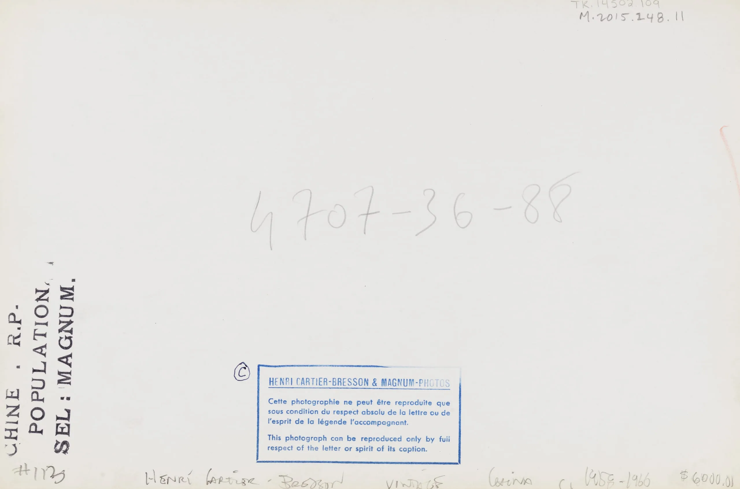 Verso of a photograph print with cream backing, showing handwritten notations, a stamped Magnum Photos copyright label in blue, and printed text in French and English.