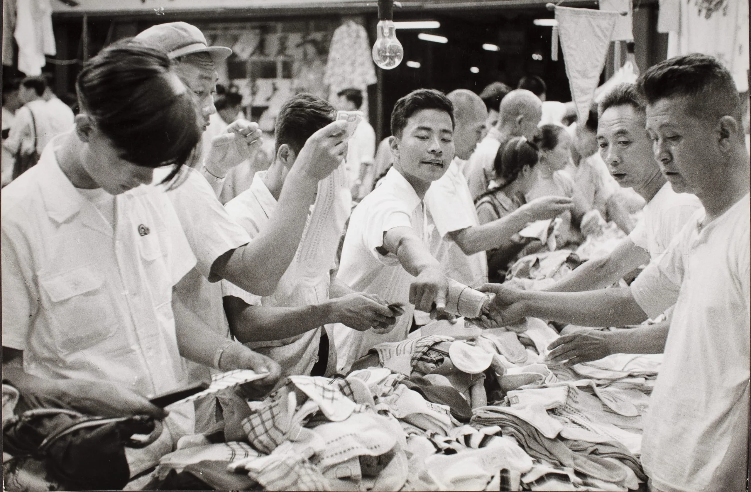 Black and white photograph of a crowded market stall, multiple people in white shirts examining piles of clothing and small textile goods on a table