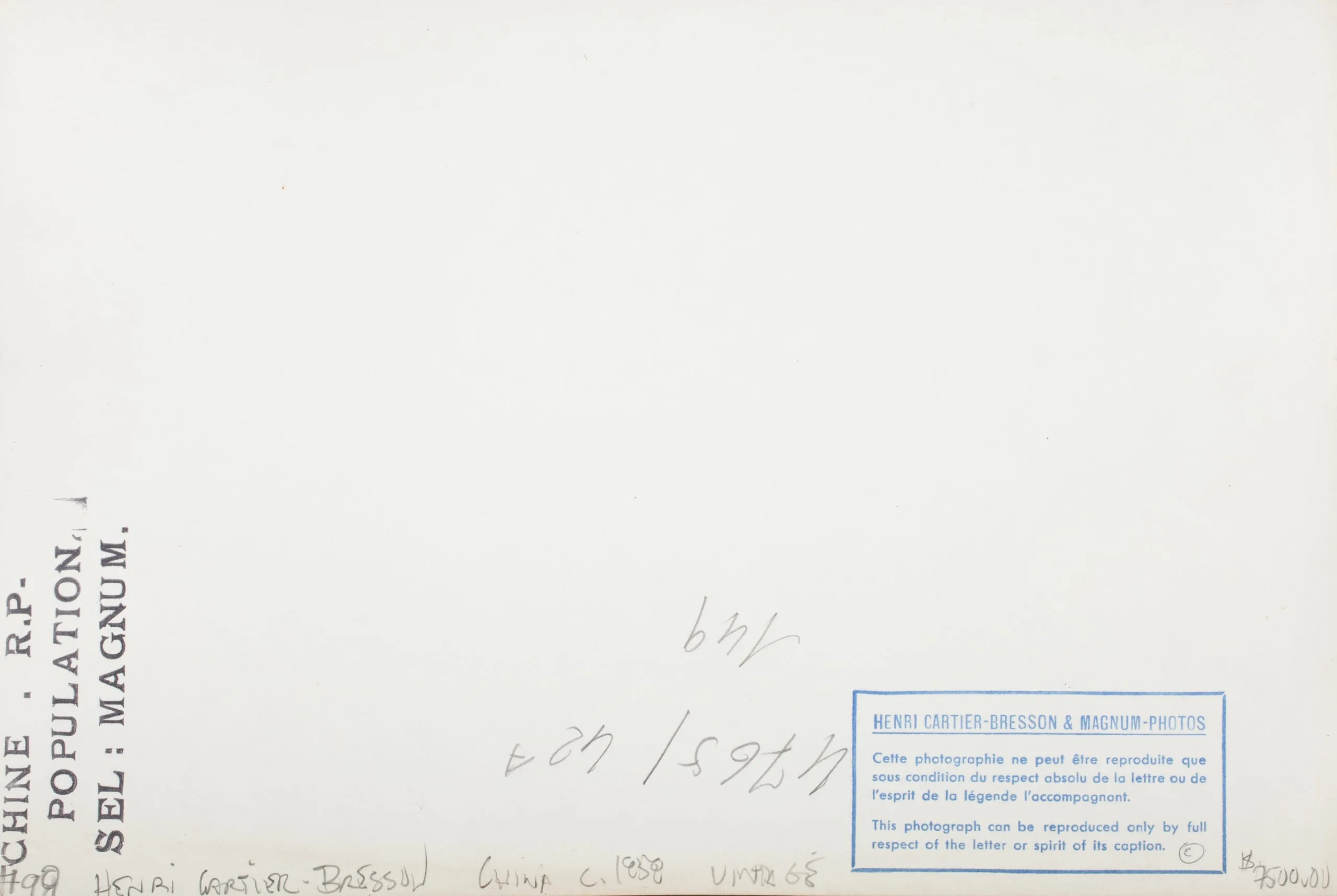 Verso of a photograph print; handwritten annotations and stamped text in French, with a blue "Henri Cartier-Bresson & Magnum Photos" reproduction rights stamp at lower right.