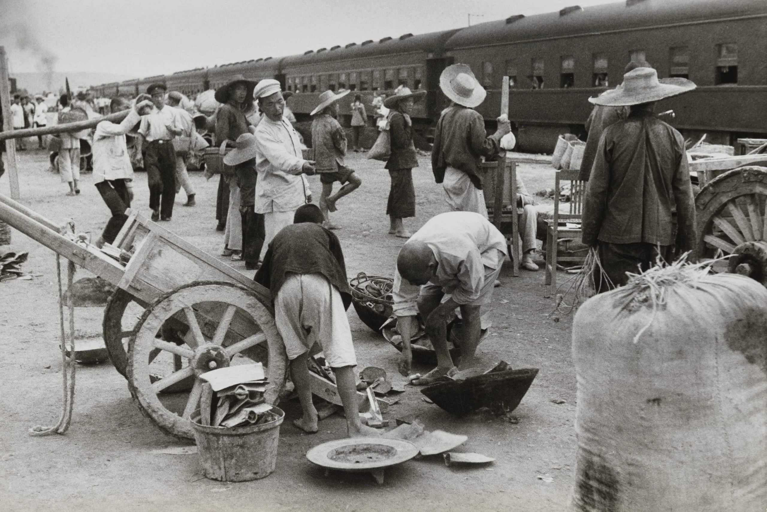 Black and white photograph of a crowded train platform with men in straw hats and work clothes loading or sorting goods near a wooden cart, long passenger train alongside