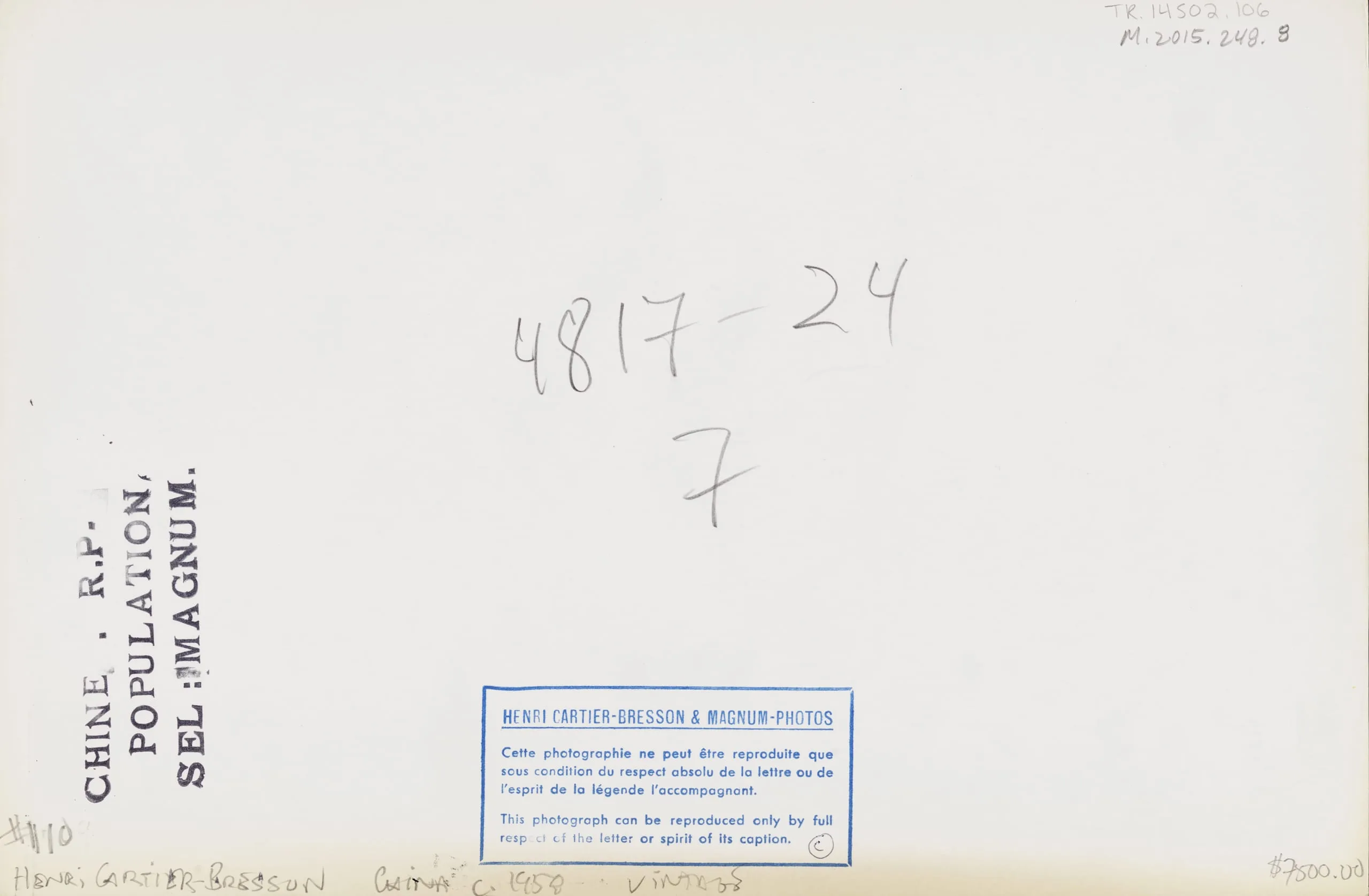 Verso of a gelatin silver print showing handwritten notations, stamped text in French reading 'CHINE. R.P., POPULATION, SEL.: MAGNUM,' and a Henri Cartier-Bresson & Magnum Photos reproduction label with French and English text.