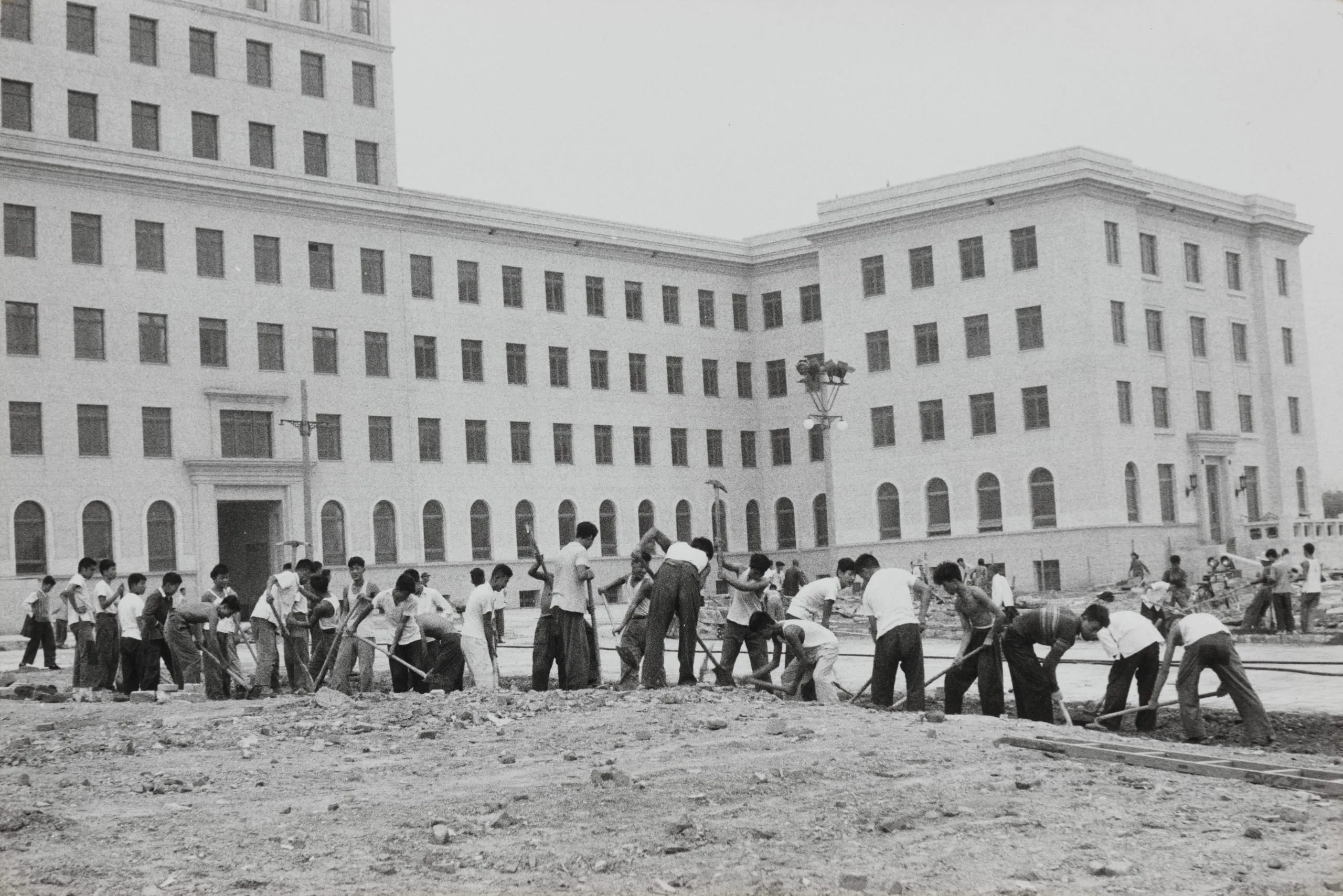 Black and white photograph of dozens of workers using shovels and long-handled tools on a construction site in front of a large multi-story neoclassical building