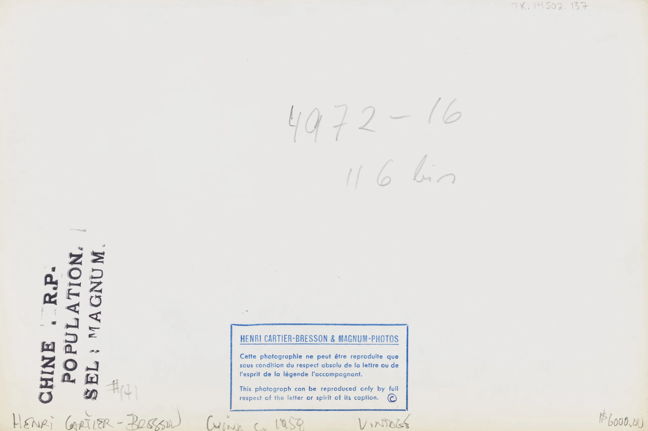 Verso of a gelatin silver print showing handwritten annotations in pencil, rubber stamps reading 'CHINE R.P. POPULATION SEL: MAGNUM,' and a blue Henri Cartier-Bresson & Magnum Photos copyright label with French and English text.