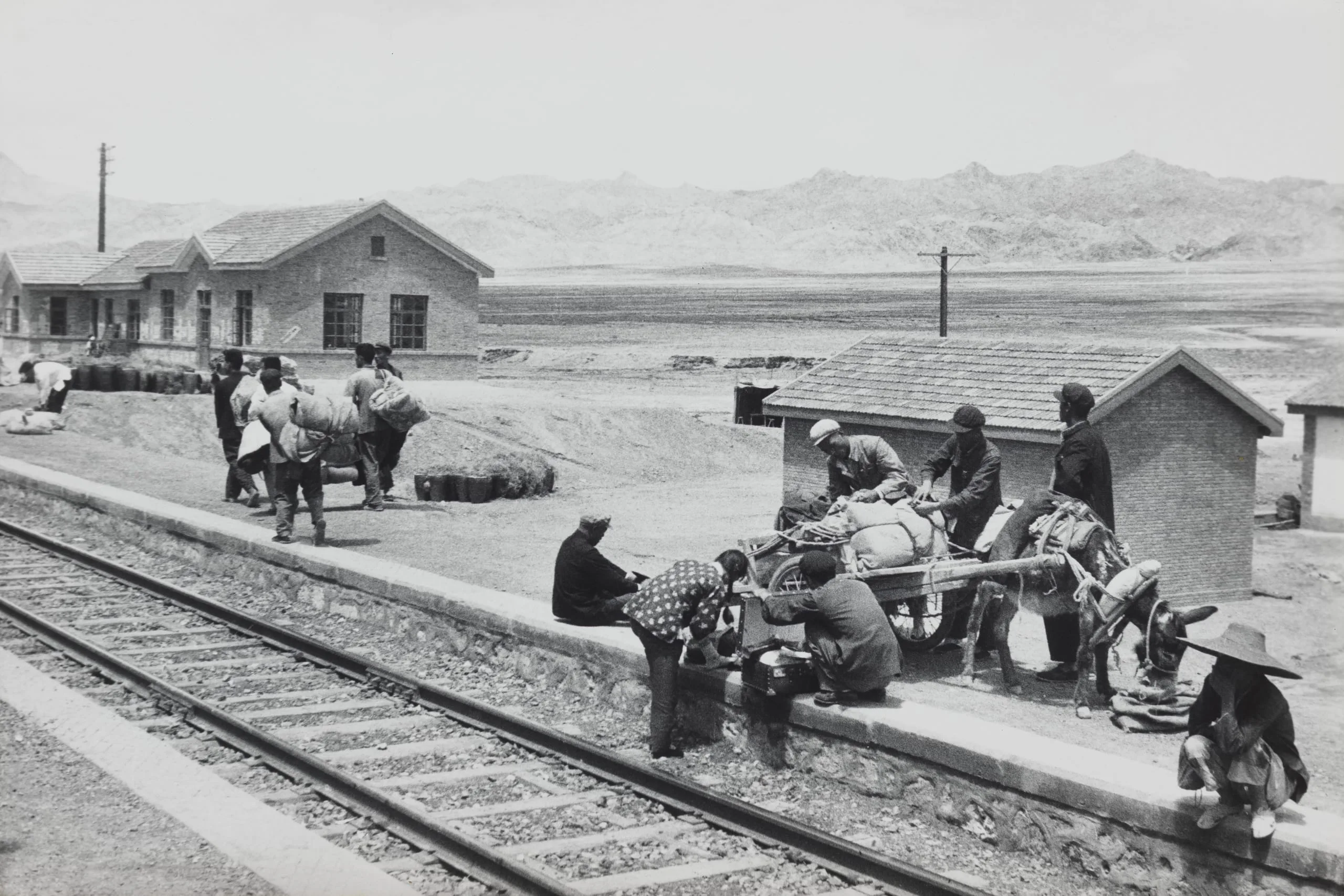 Black and white photograph of figures loading a donkey with bundled goods along a railway platform, flat arid plain and mountains in the distance