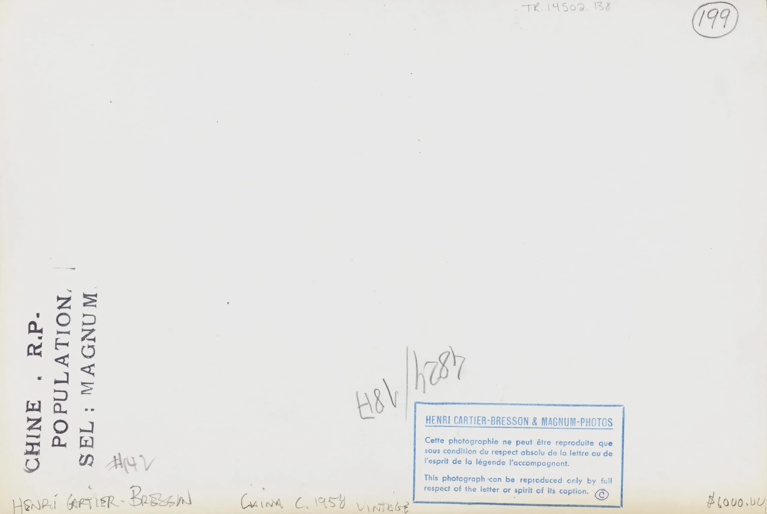 Verso of a gelatin silver print showing typed and handwritten annotations, including a blue Henri Cartier-Bresson & Magnum Photos copyright stamp, penciled numbers, and rotated text reading 'CHINE · R.P. POPULATION. SEL : MAGNUM'