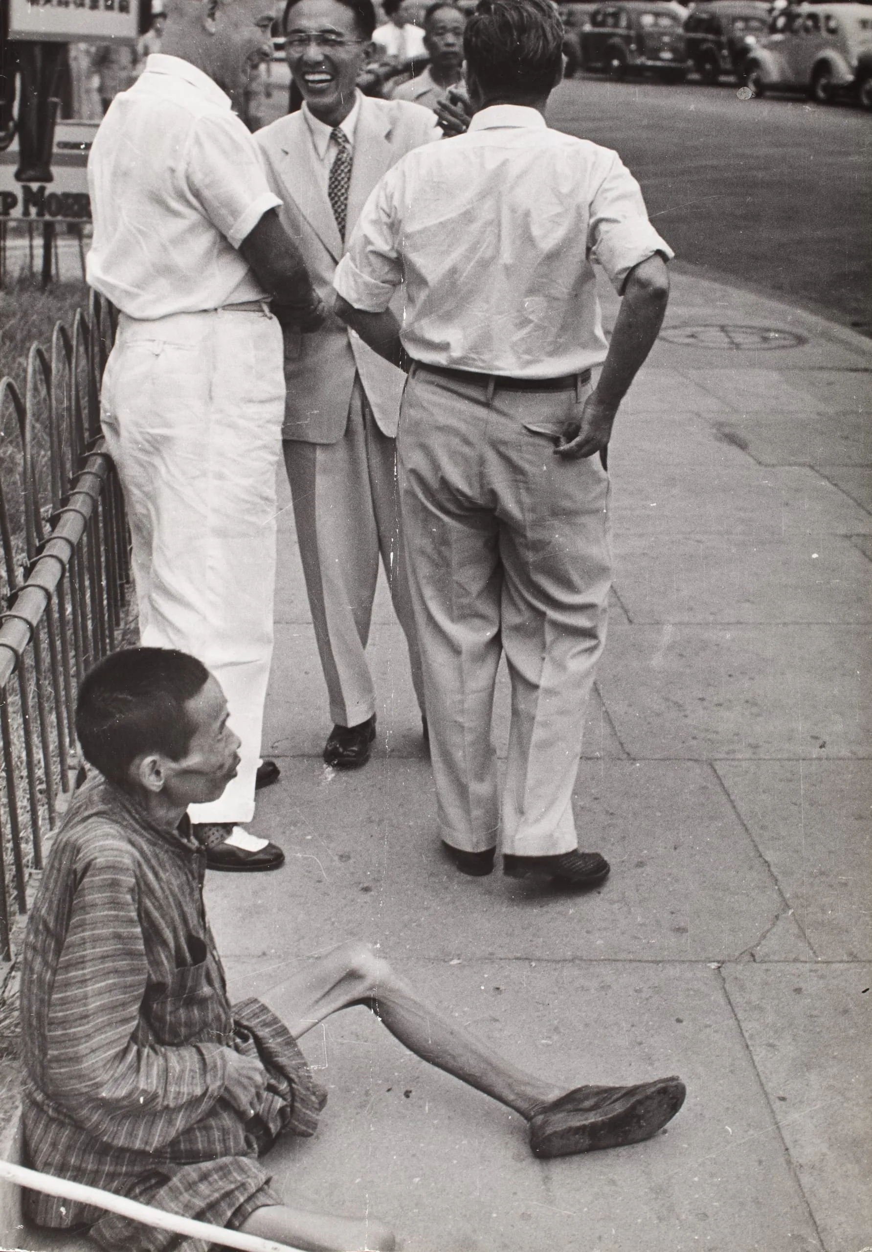 Black and white photograph of a seated emaciated man on a sidewalk, legs extended, while three well-dressed men stand conversing behind him