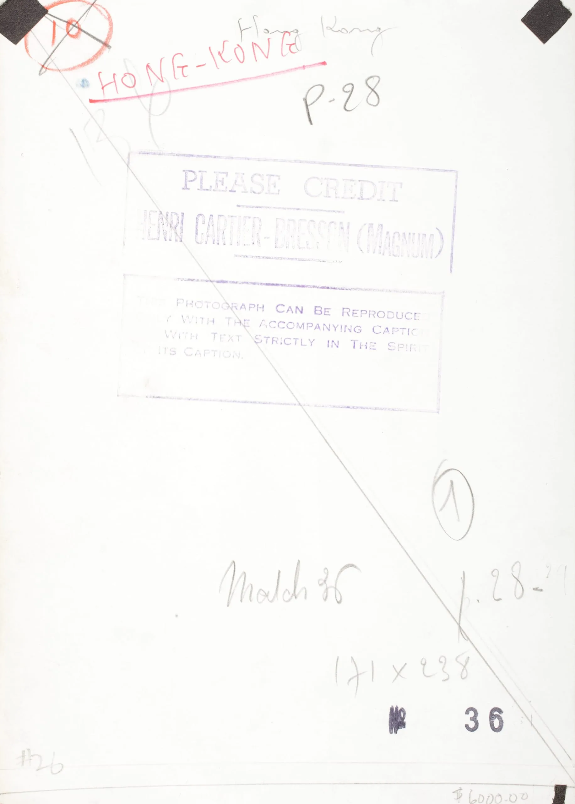 Verso of a photograph print with handwritten annotations in pencil and red ink, rubber stamps with credit and reproduction text, and circled numbers.