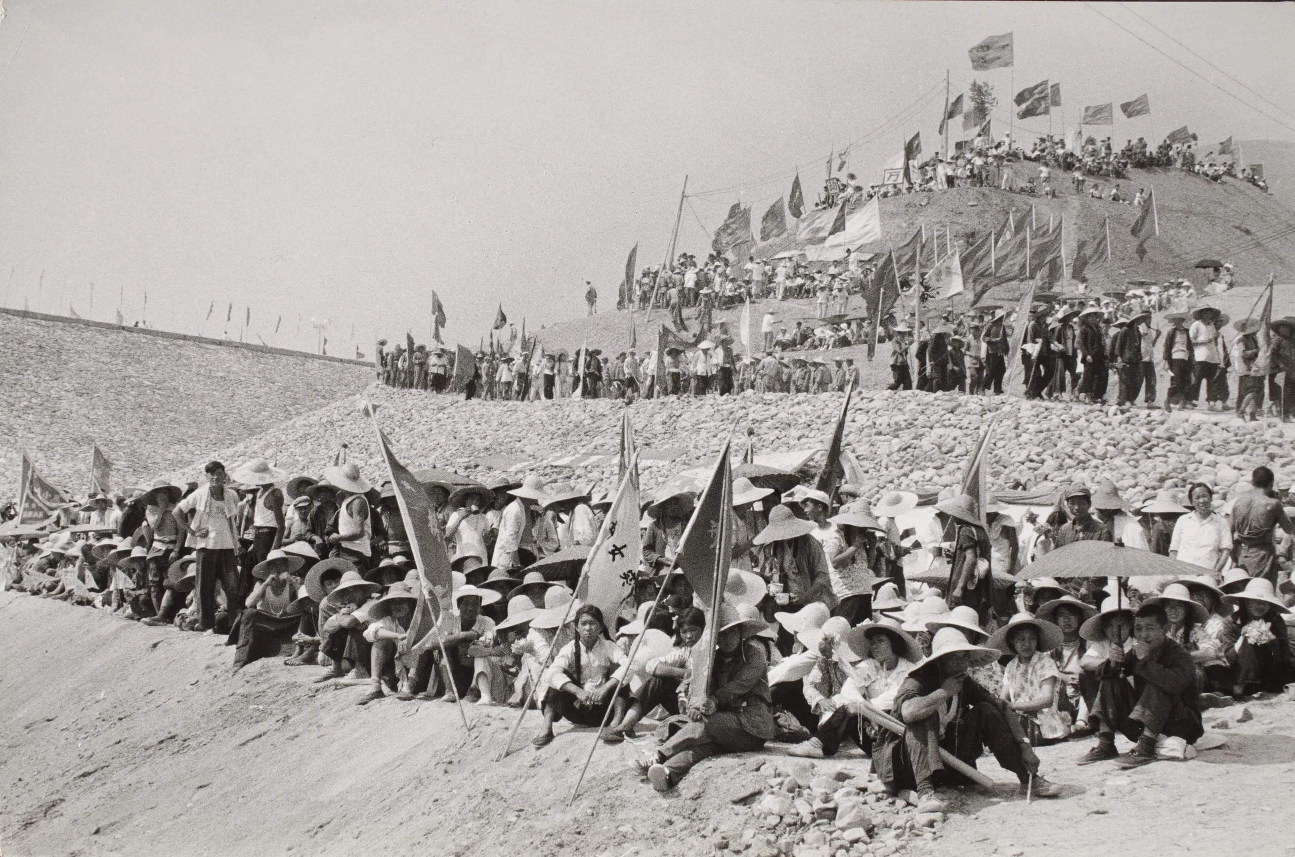 Black and white photograph of a large crowd seated along a sloped earthen embankment, many wearing conical straw hats and holding flags or pennants, with additional groups and flags visible higher on the slope