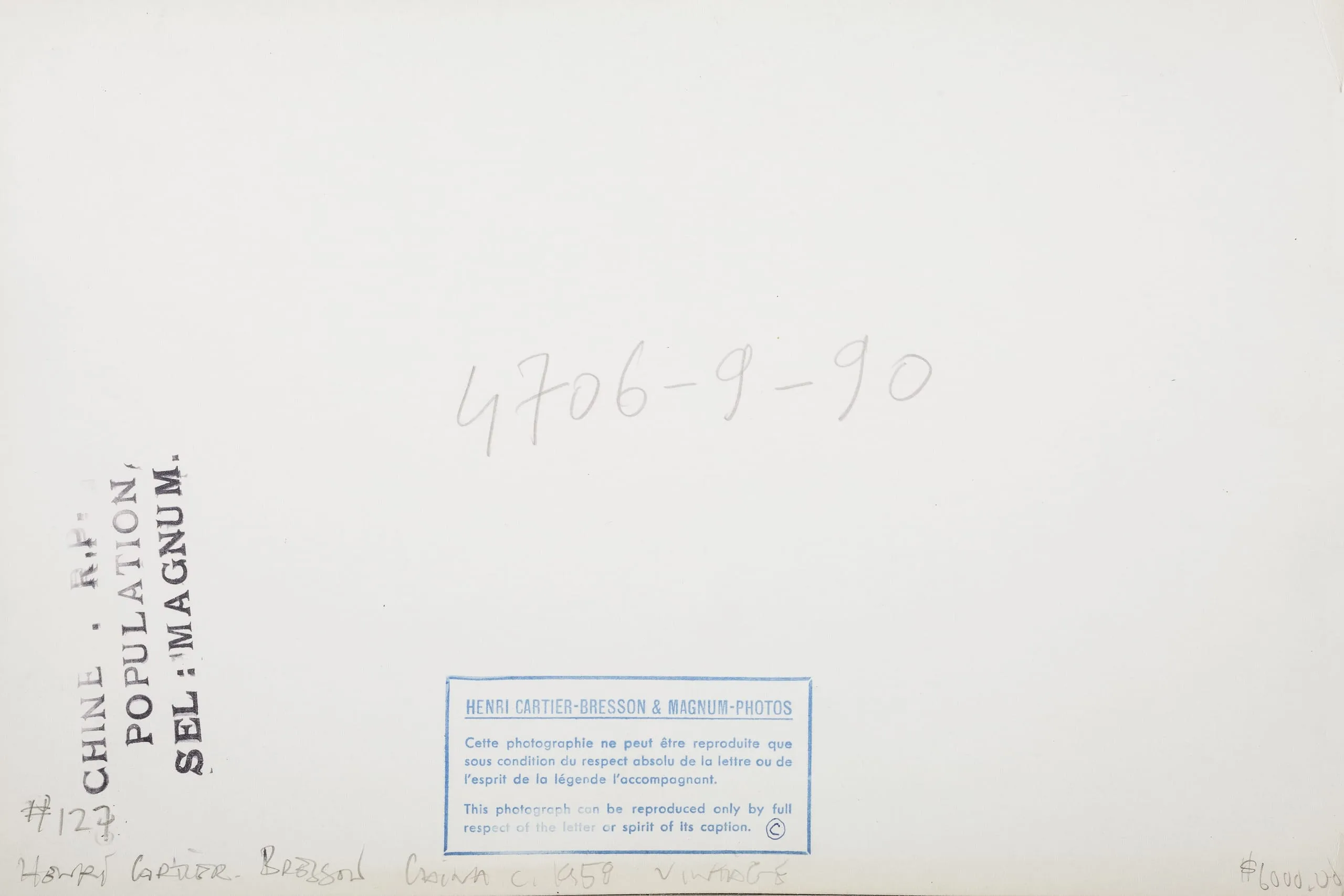 Verso of a gelatin silver print; plain white surface with handwritten pencil notation '4706-9-90,' a blue Henri Cartier-Bresson & Magnum Photos reproduction rights stamp in French and English, a black rubber stamp reading 'CHINE: RIZ, POPULATION, SEL: MAGNUM,' and handwritten annotations along the bottom edge.