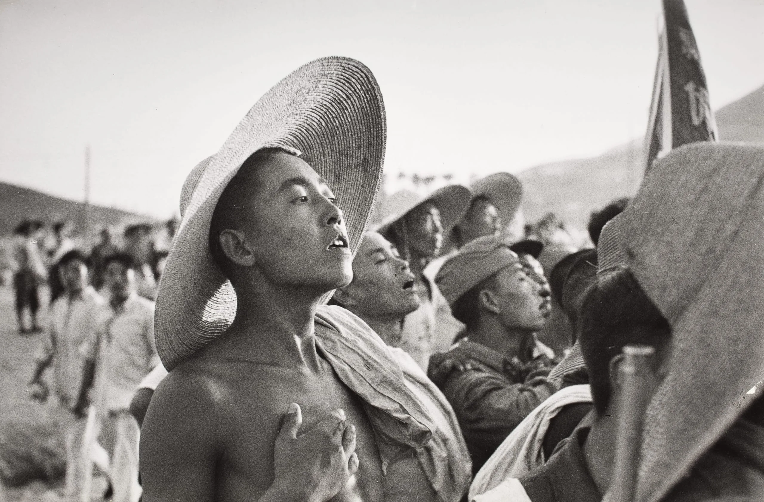 Black and white photograph of a group of people outdoors, the closest figure shirtless with a wide woven straw hat, chin tilted up and mouth open, others similarly posed behind him