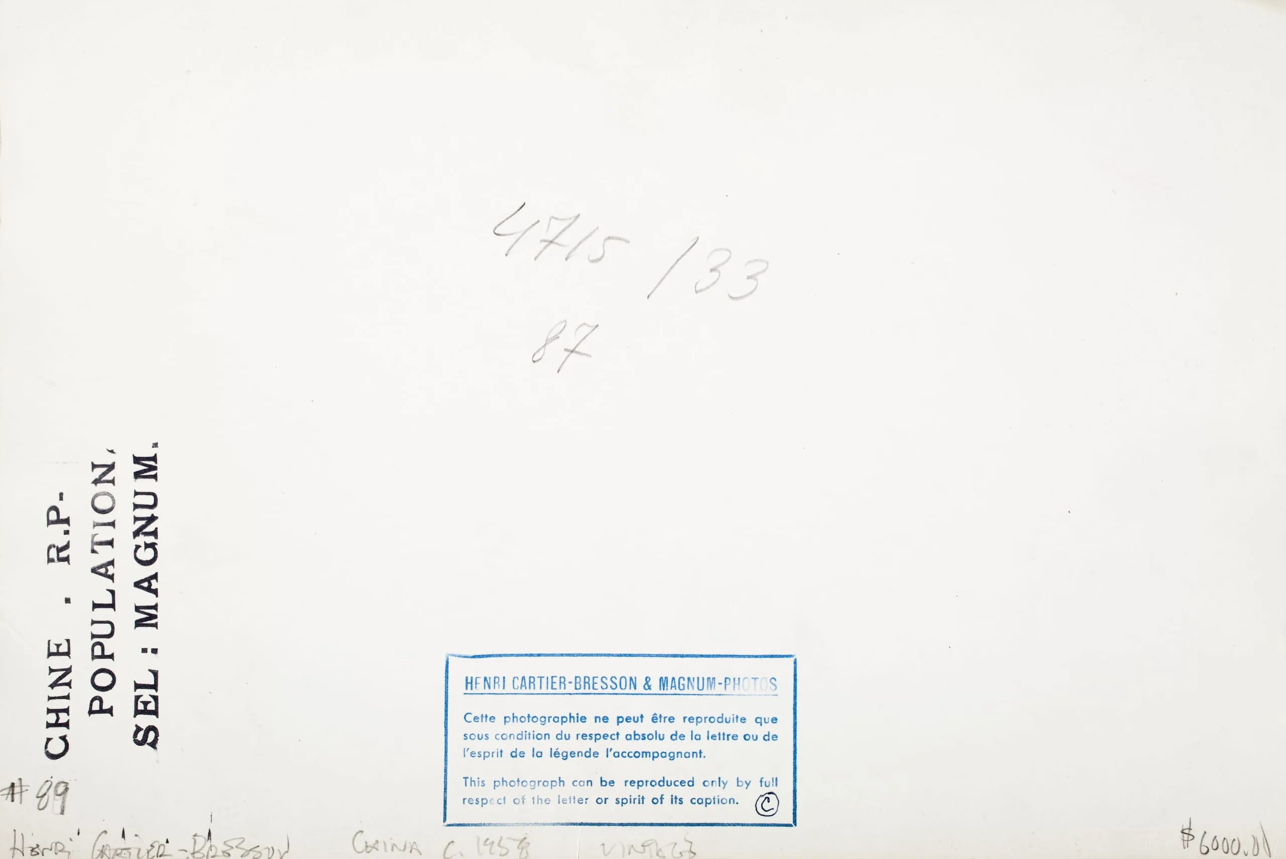 Verso of a gelatin silver print showing handwritten notations, a printed Henri Cartier-Bresson & Magnum Photos copyright stamp in blue, and rotated text reading 'CHINE · R.P. POPULATION, SEL : MAGNUM.' along the left edge.
