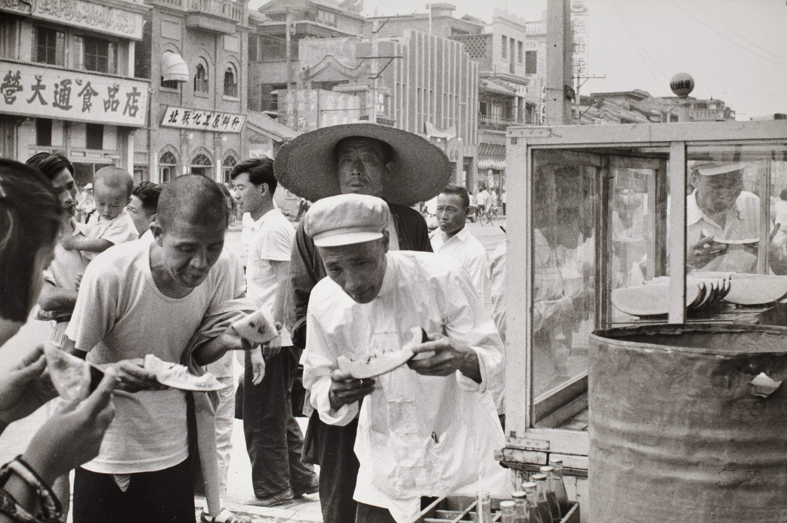 Black and white photograph of a street food scene in China, men in work clothes eating from small portions at an outdoor stall, crowd and Chinese-language shop signs in the background