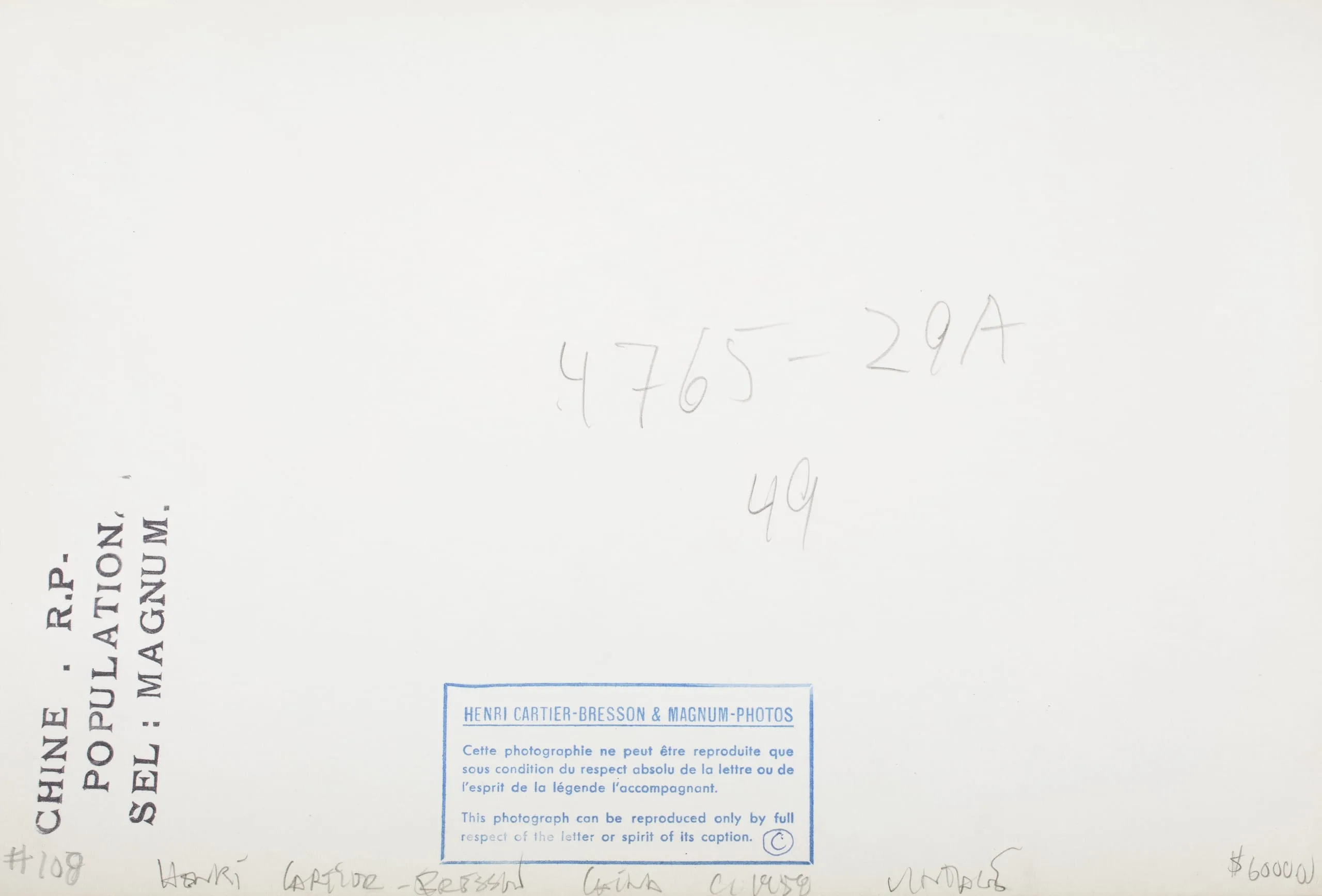 Verso of a photograph print, showing handwritten annotations, a penciled reference number '4765-29A,' and a printed Henri Cartier-Bresson & Magnum-Photos reproduction rights stamp in French and English.