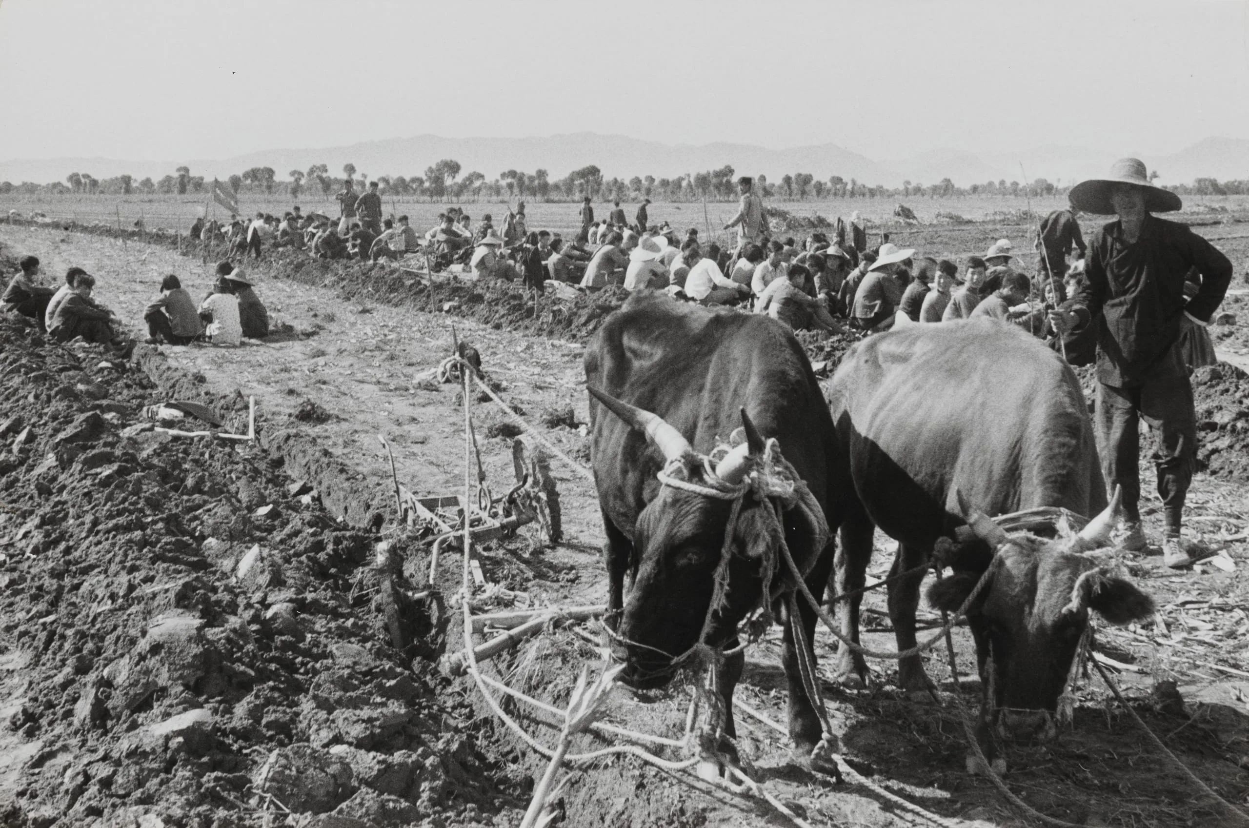 Black and white photograph of dozens of workers digging a trench across a flat field, with two harnessed oxen and a wooden plow in the foreground and mountains in the distance