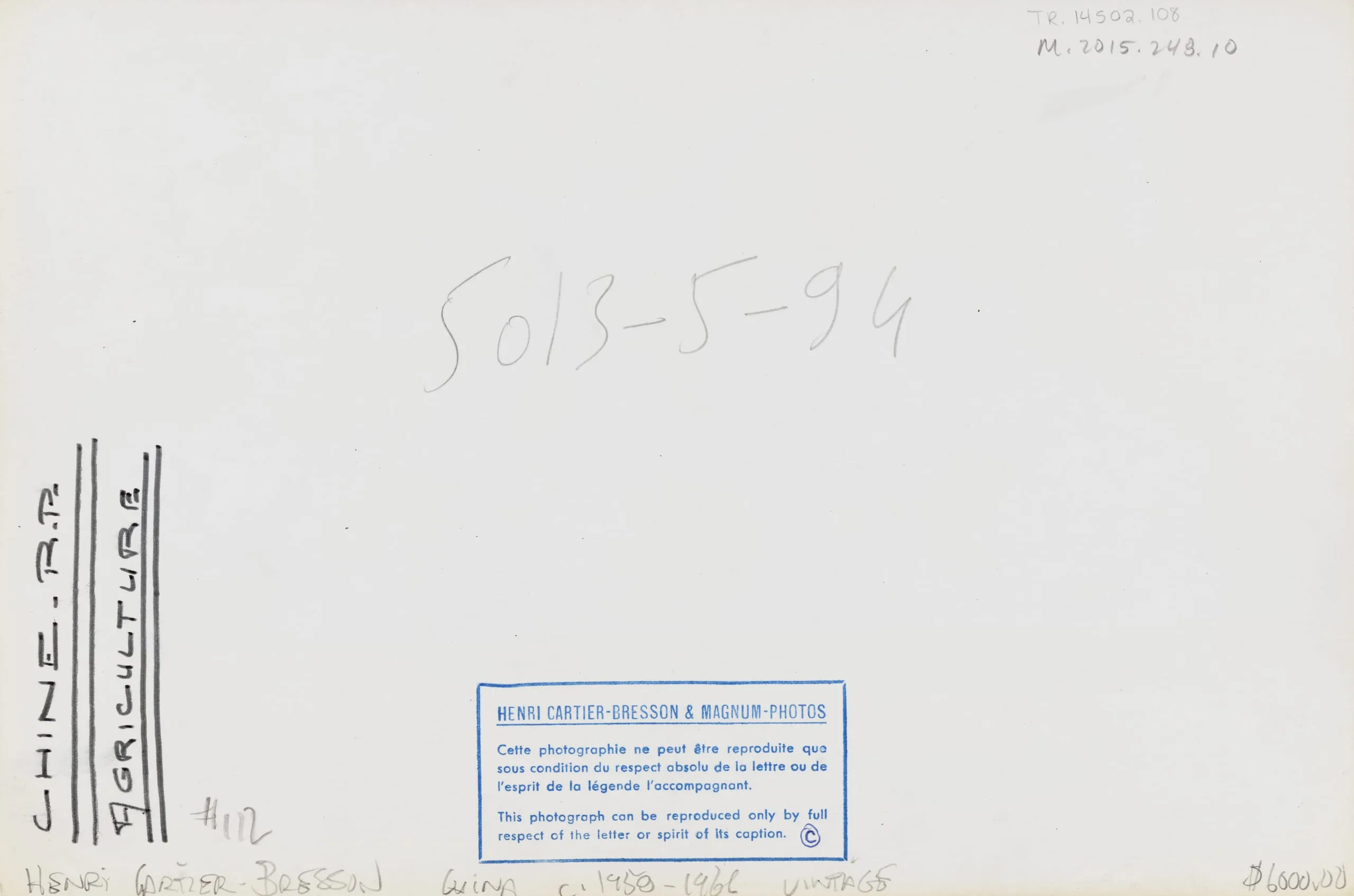 Verso of a gelatin silver print showing handwritten annotations, a penciled reference number, vertical text strips at left, and a blue Henri Cartier-Bresson & Magnum Photos copyright stamp with French and English text.