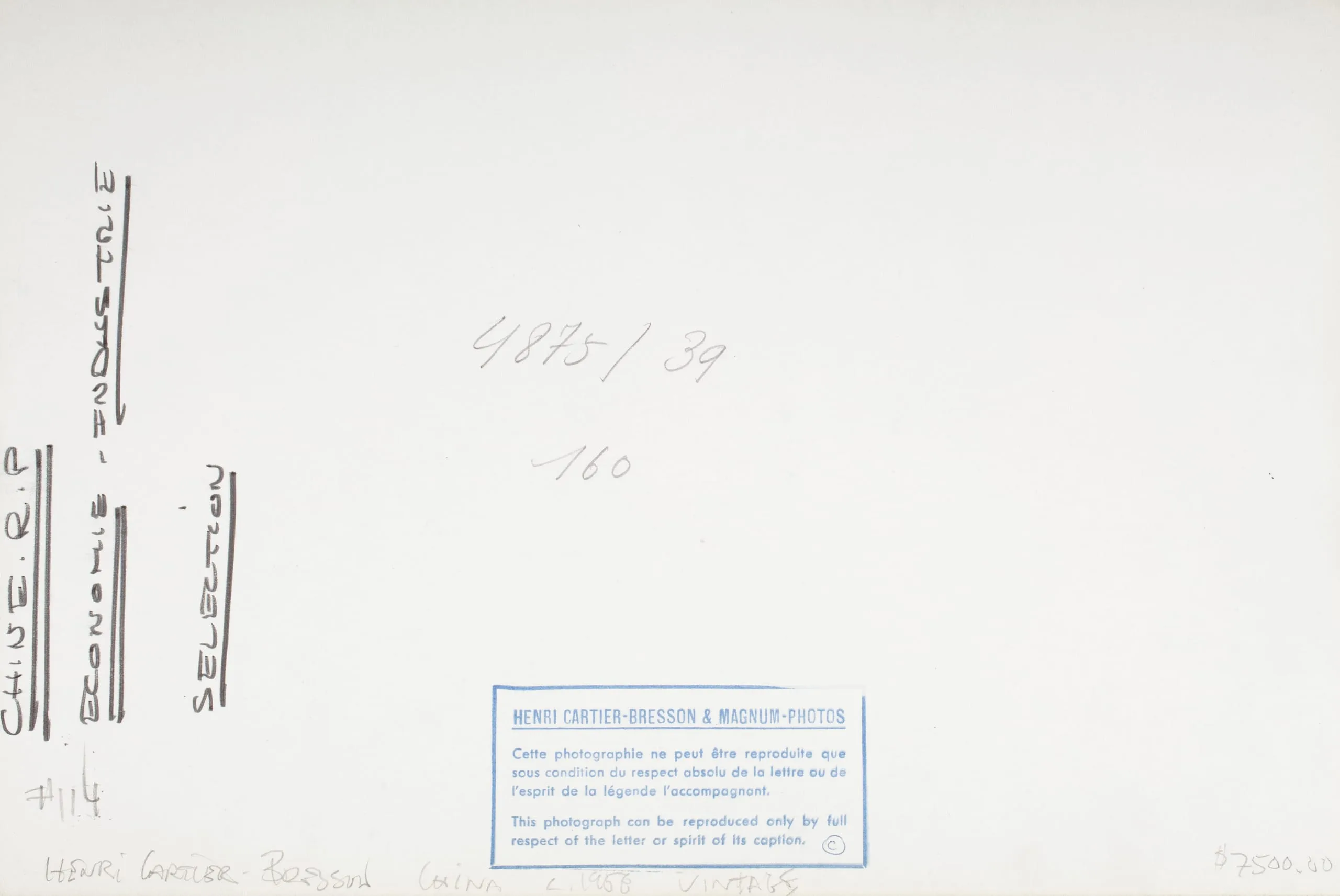 Verso of a photographic print showing handwritten annotations, stamped text, and a blue-bordered Henri Cartier-Bresson & Magnum Photos copyright label with text in French and English.