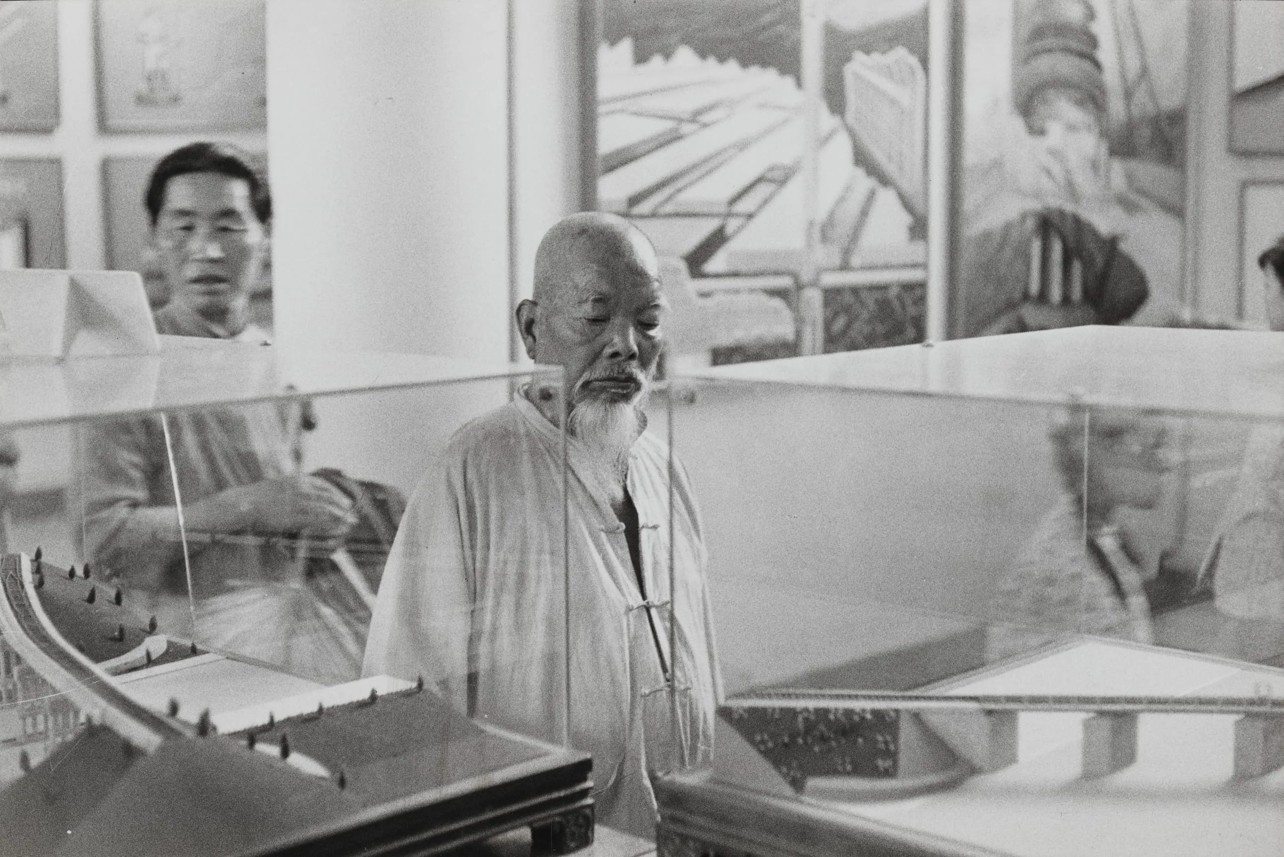 Black and white photograph of two men in an exhibition space, an older man with a white beard in a traditional frog-closure jacket standing behind a glass display case holding a scale model