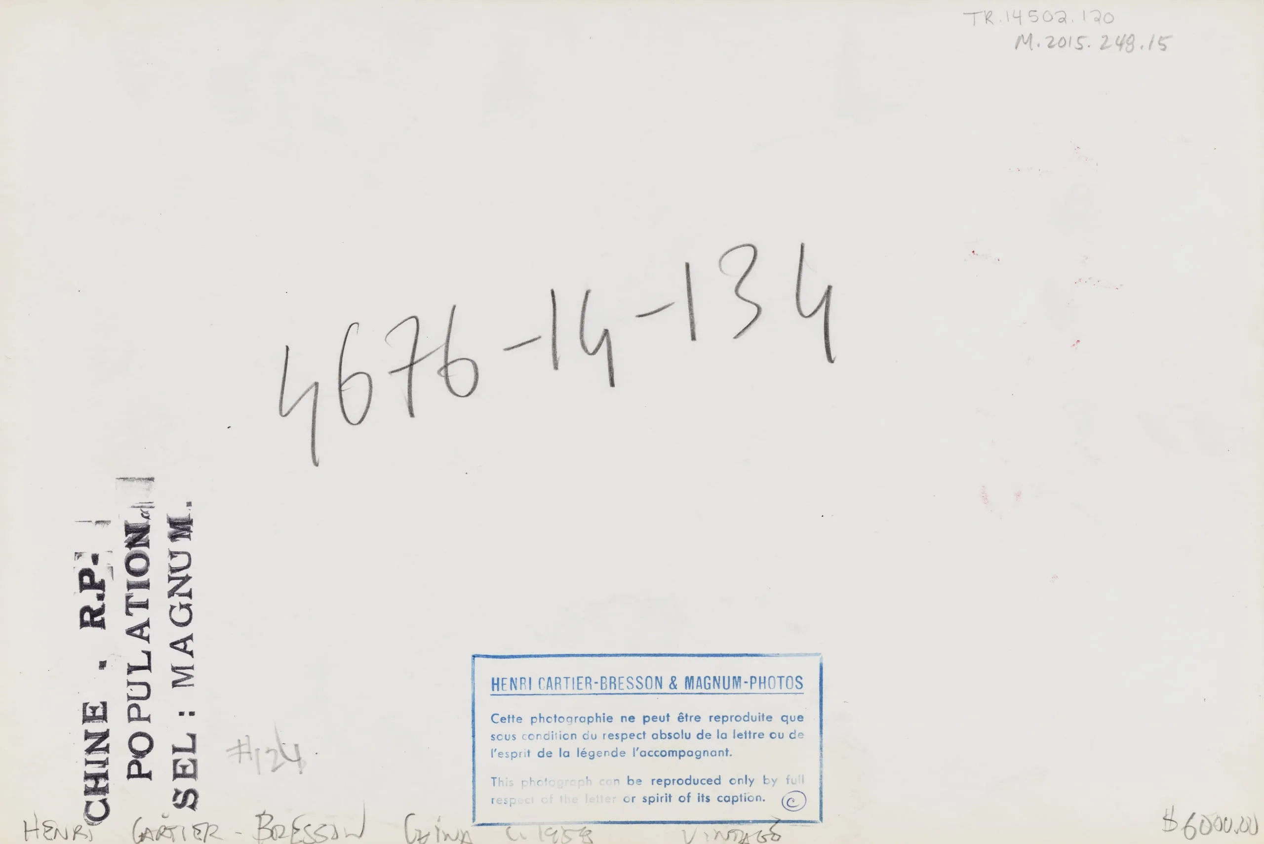 Verso of a gelatin silver print with handwritten notations, stamped text, and a printed Magnum Photos copyright label with French text.