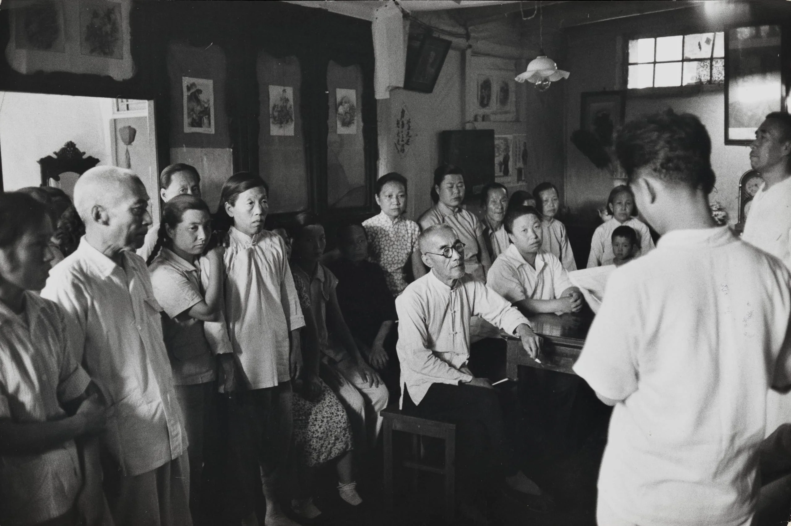 Black and white photograph of a group of roughly twenty East Asian men, women, and children gathered indoors, facing a figure whose back is turned at the right edge of the frame