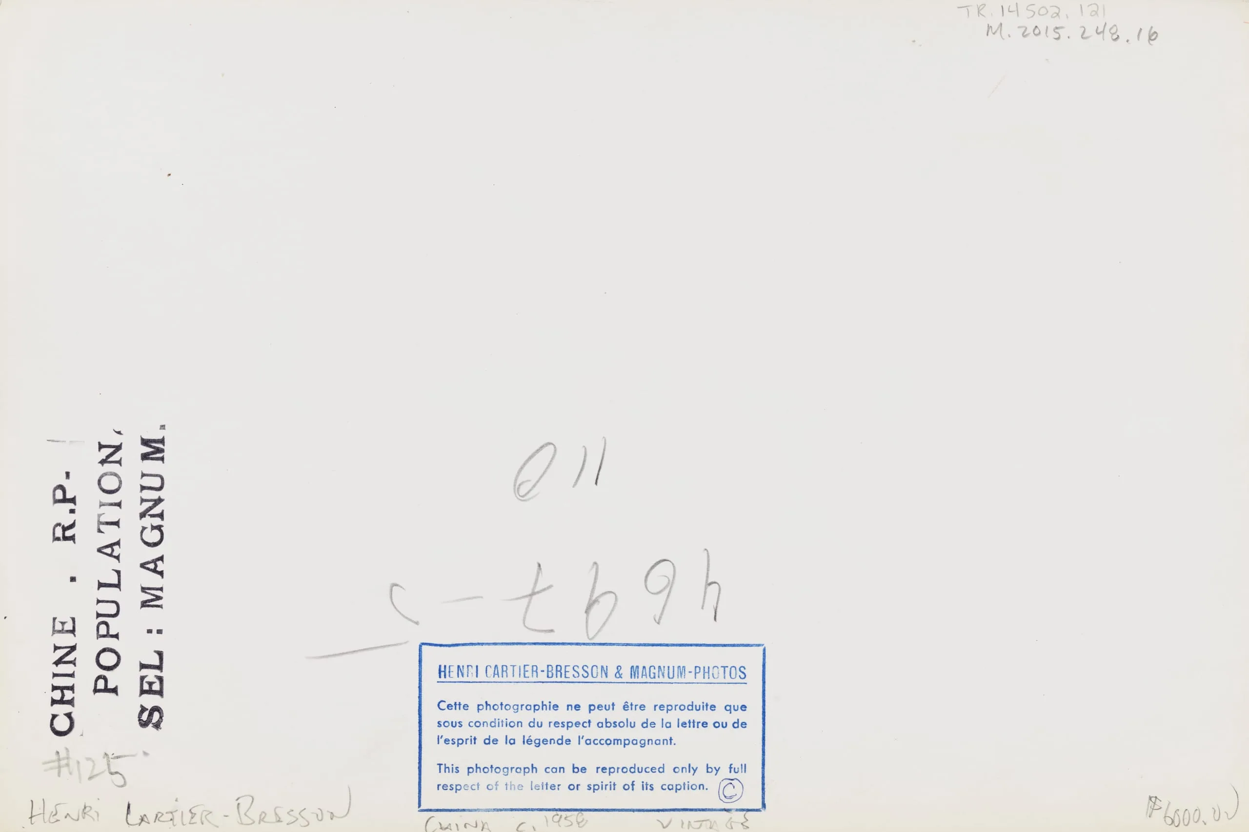 Verso of a gelatin silver print showing handwritten annotations, a blue Henri Cartier-Bresson & Magnum Photos reproduction rights stamp, penciled notations, and vertically printed text reading "CHINE . R.P. — POPULATION, SEL : MAGNUM."