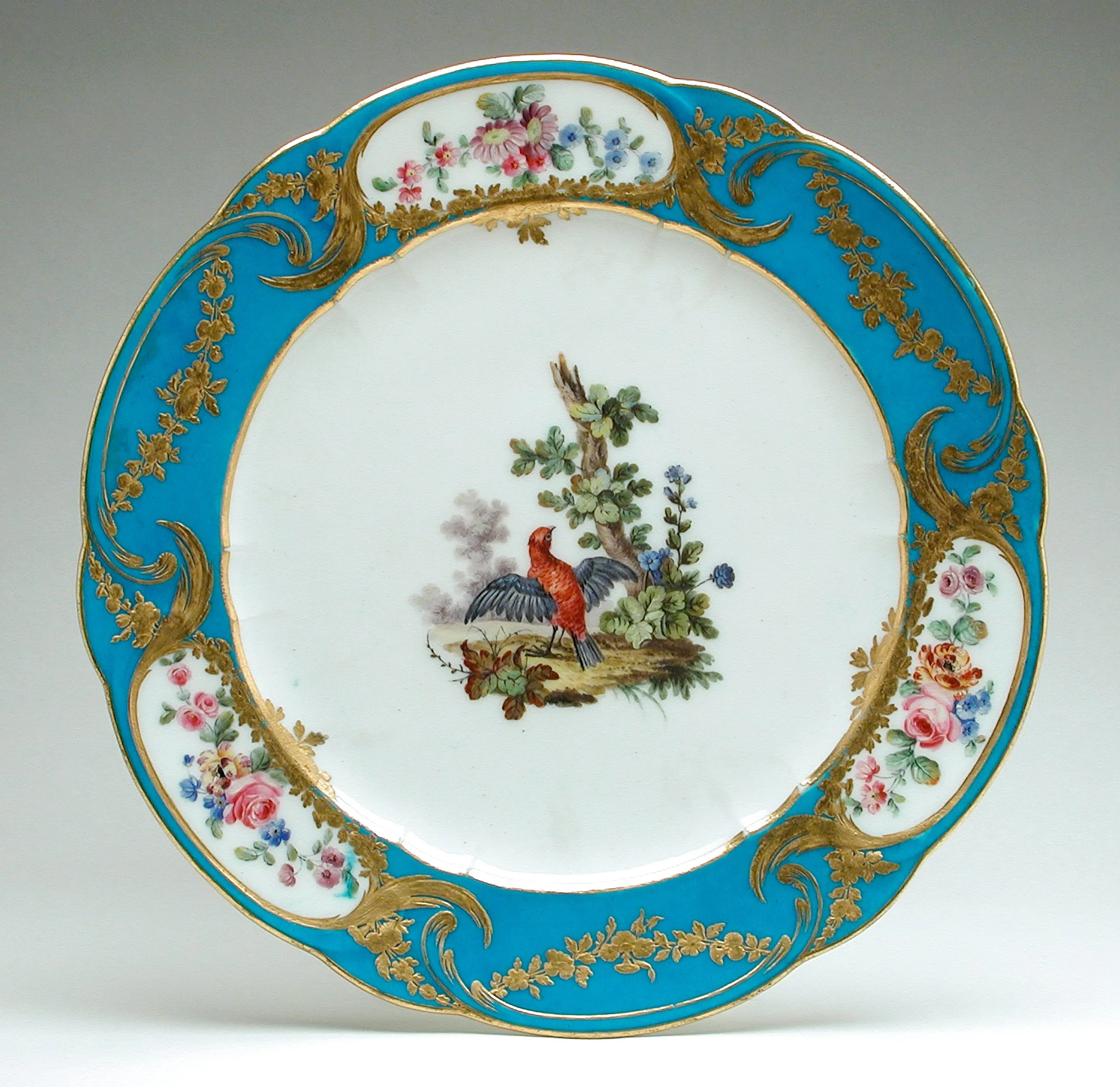 Porcelain plate with turquoise rim, gilded rococo scrollwork, four white cartouches painted with flower bouquets, and a central scene of a red-and-blue bird beside a leafy shrub