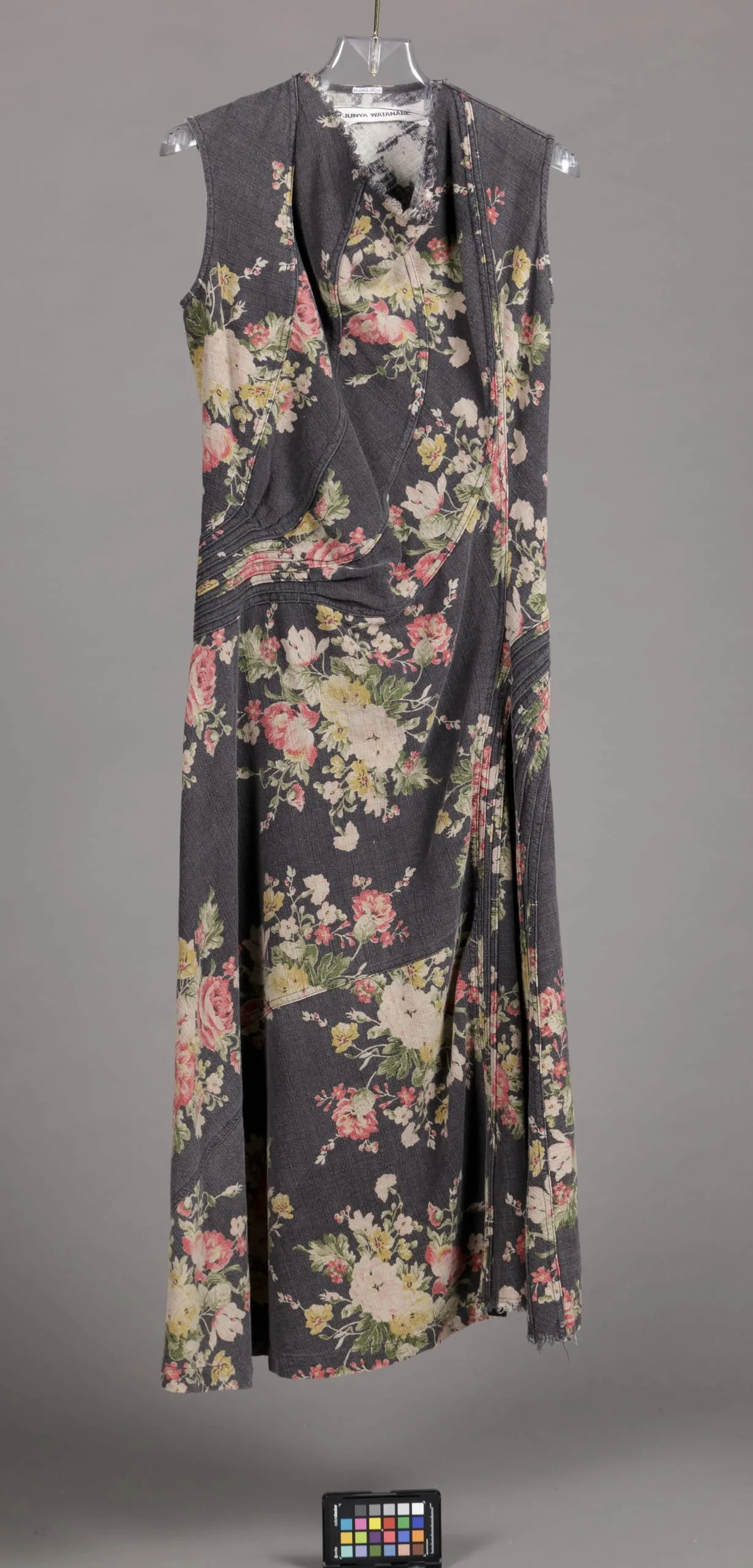 Sleeveless wrap dress on a clear hanger, dark charcoal ground with large-scale pink, cream, and green floral print, diagonal seaming and ruched neckline detail