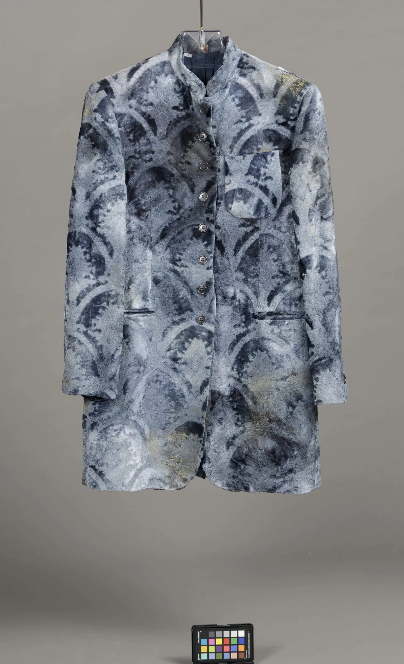 - Rayon/cotton cut and voided velvet with self weft patterning, printed with gold pigment.
