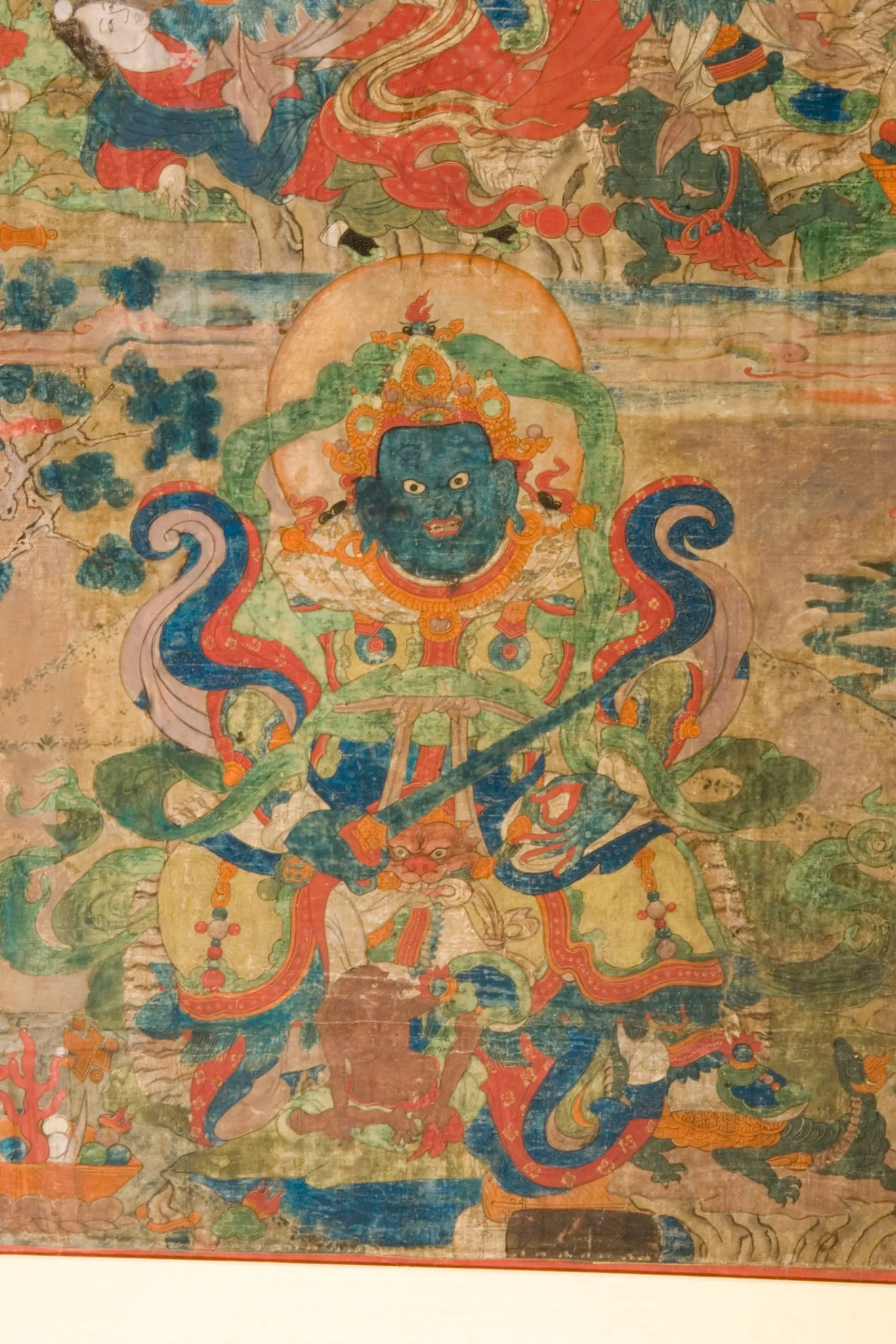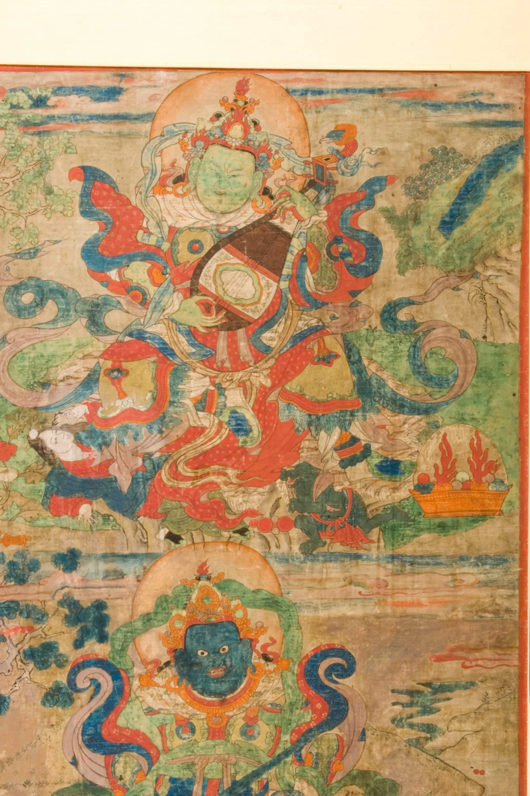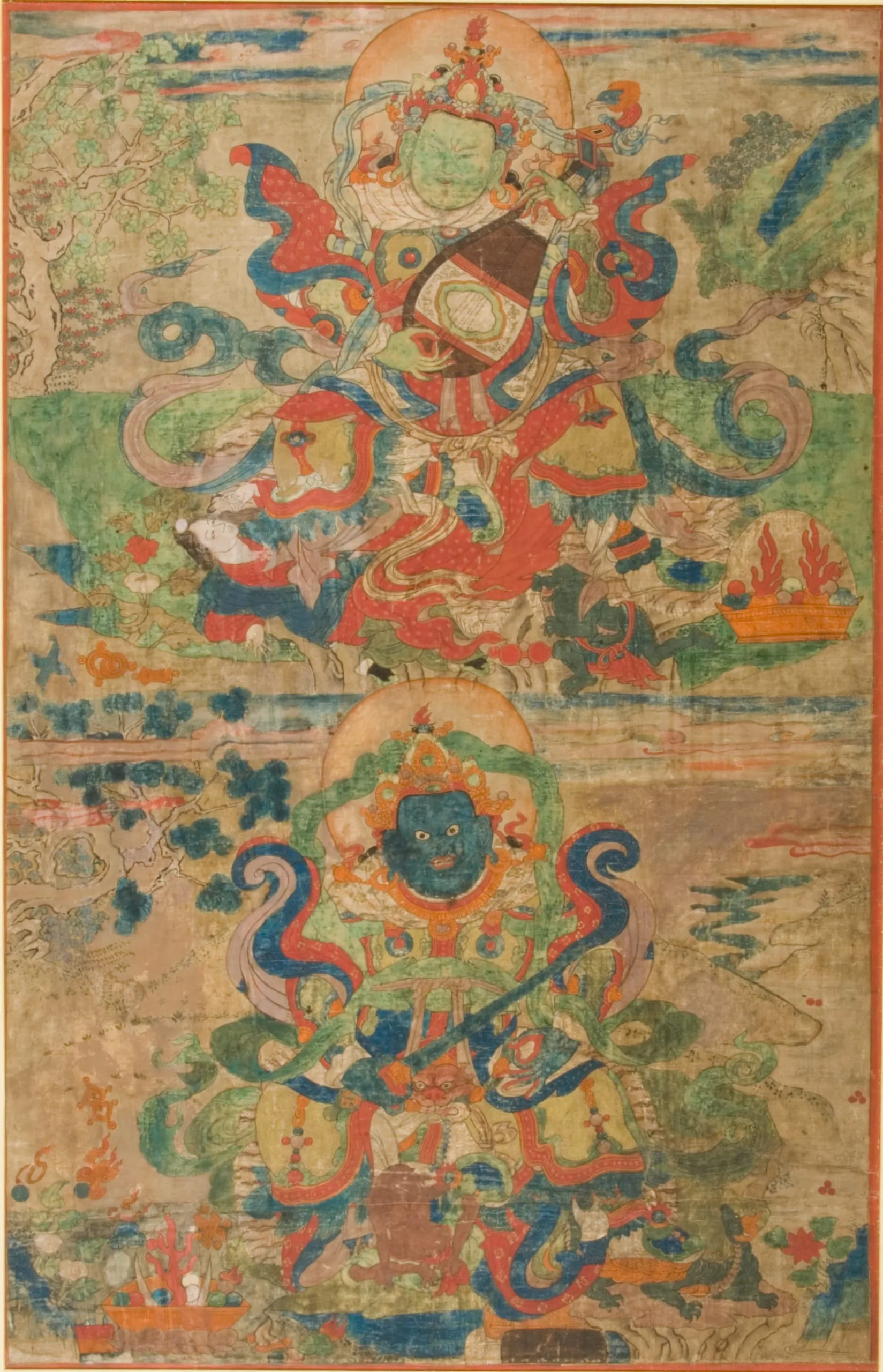 This painting depicts two of the Guardian Generals of the Directions (Lokapalas). On the top, is Dhritarashtra (Whose empire is firm), Regent of the East. He is said to be white-skinned, but here is pale green. He plays a Chinese lute (pipa). On the bottom, is Virudhaka (He who has sprouted), Regent of the South. He is blue-skinned and carries a long sword. To his right are several of the precious group of seven auspicious royal gems (sapta ratna) that served as insignias for the ancient South Asian cultural concept of the Universal Monarch (chakravartin). Beside his waist are the square golden earrings of the minister. By his ankles are the golden stylized crossed swords that were the Chinese insignia of the military general. In a golden bowl at the bottom are various symbols, including the two tusks of the precious elephant, several jewels, and a branch of pink coral. To the right of the bowl are the unicorn or rhinoceros horns. To the left of the bowl are perhaps two texts with silk covers. Both Regents are clad in Mongolian garb. See also M.77.155.3 and M.82.169.22.