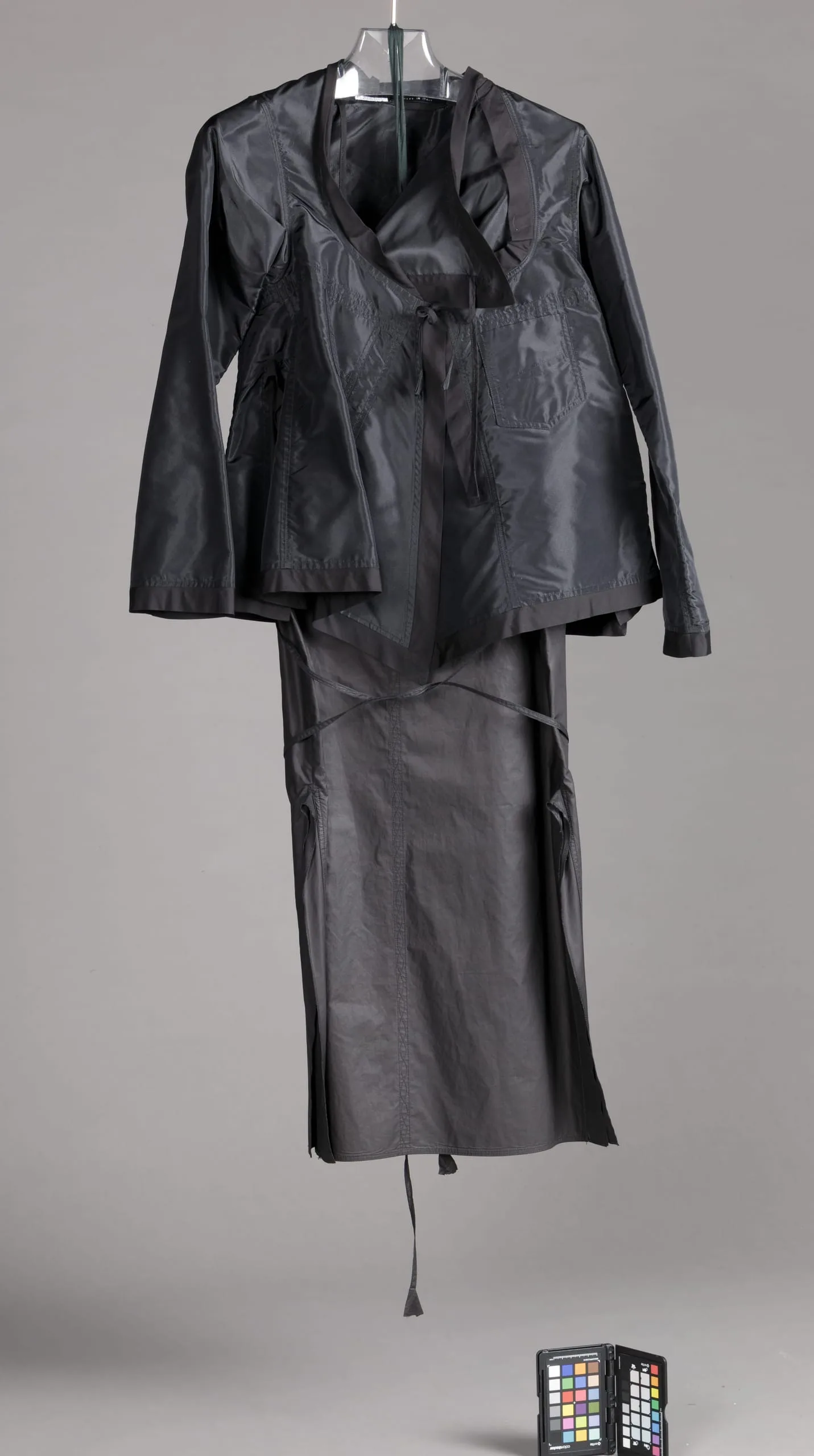 - Jacket: Silk plain weave (faille), cotton plain weave, cotton embroidery. Skirt: cotton plain weave, cotton embroidery.