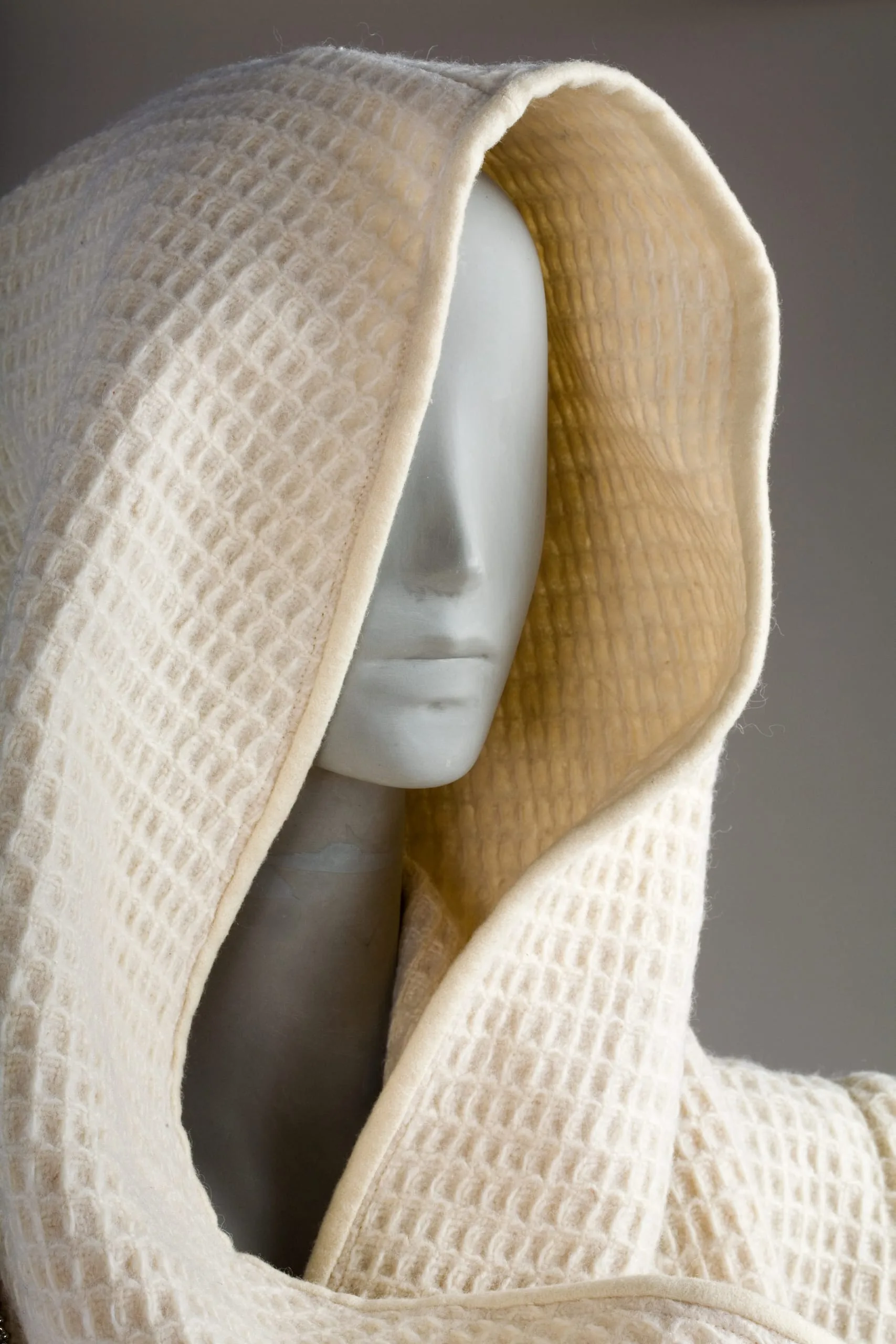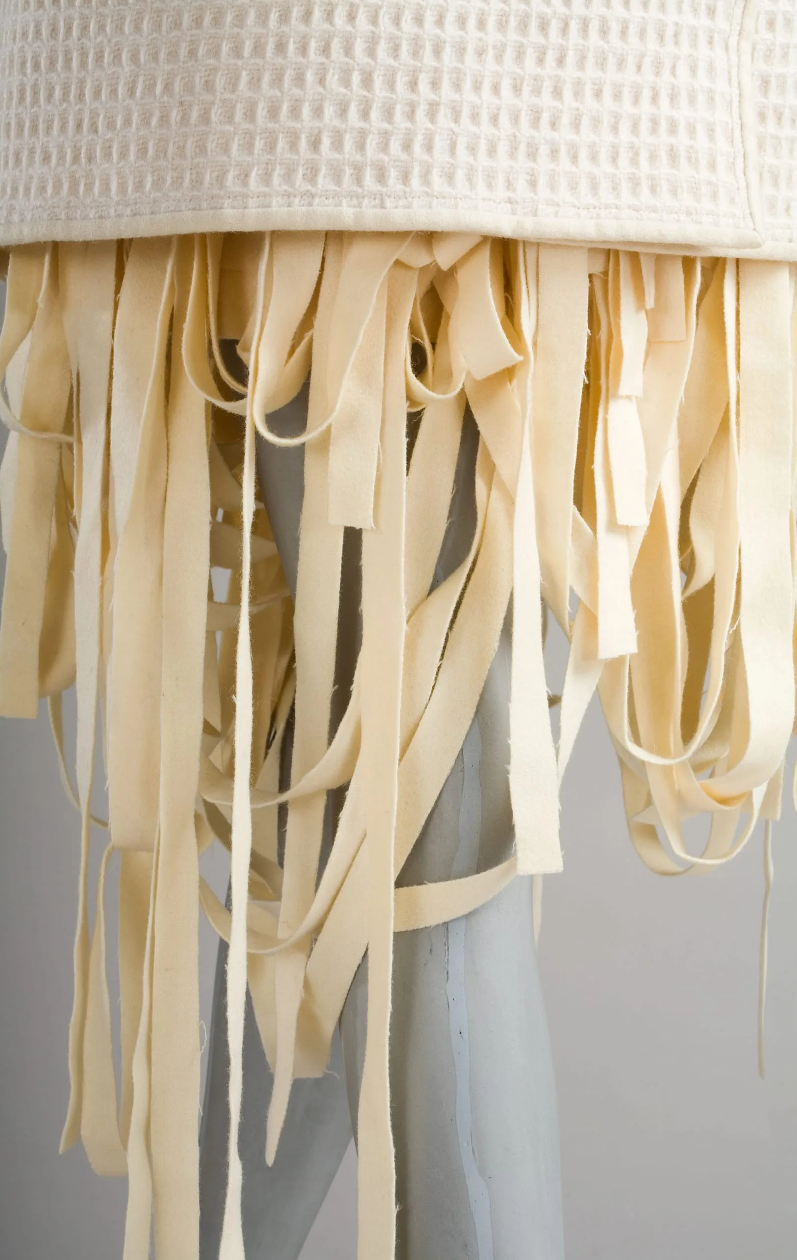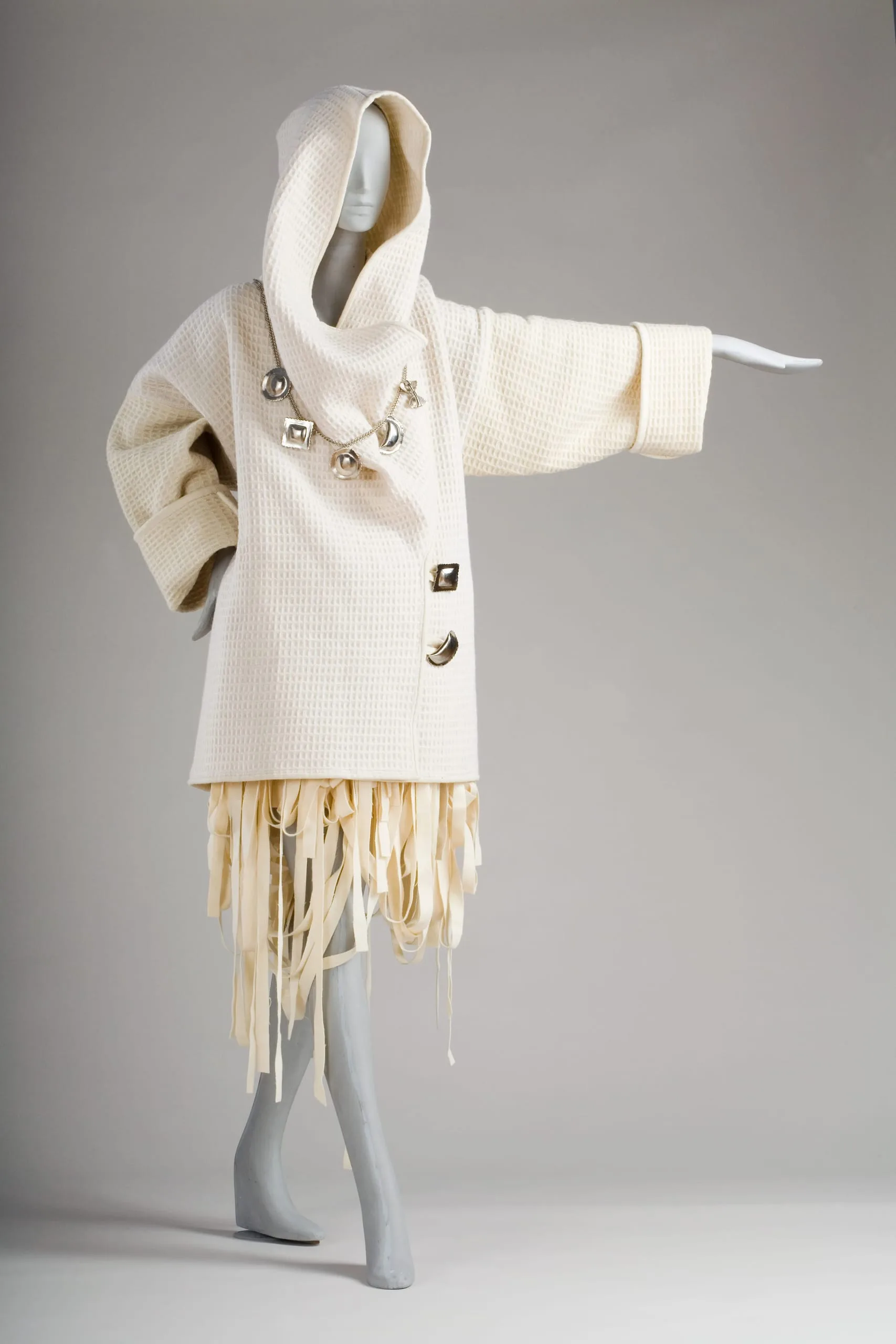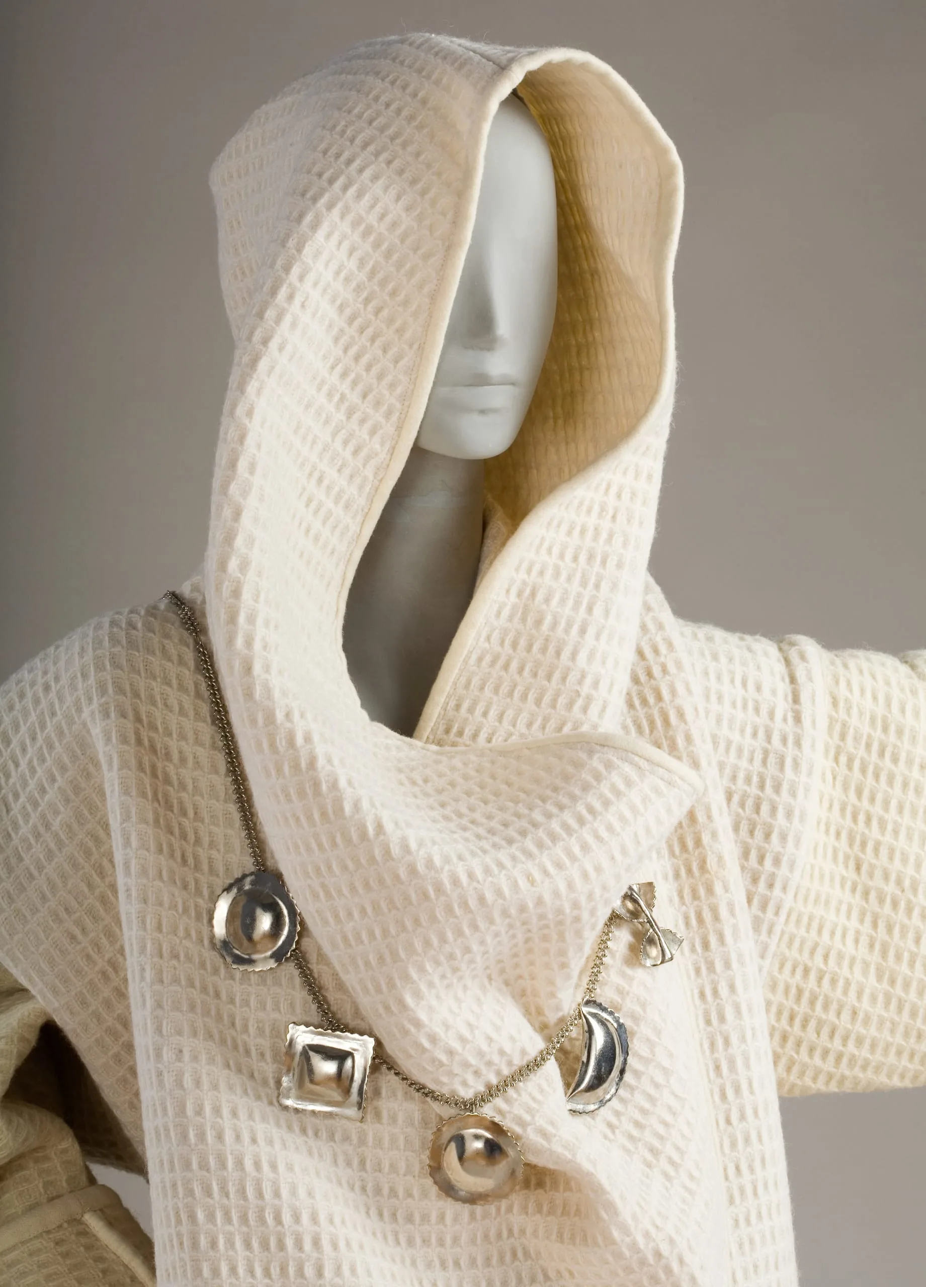 - Jacket: wool waffle weave; skirt: wool; buttons and necklace: silver metal