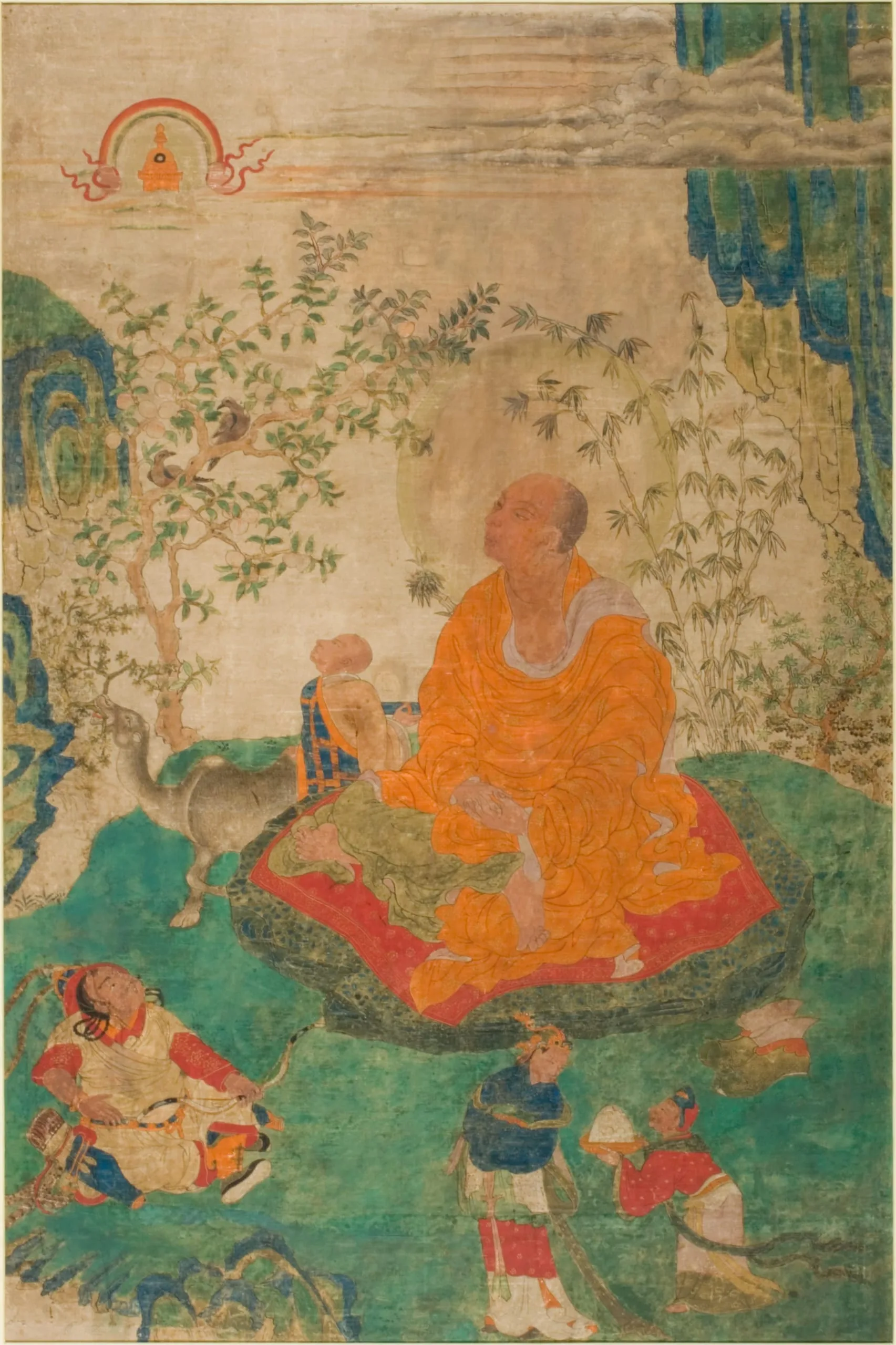 This painting portrays the Arhat Abheda (Without Fracture; set no. 16). He is typically represented as holding a stupa or chaitya (reliquary monument) in his hands, but here the stupa is floating in the heavens and the nimbate Abheda is gazing up at it.