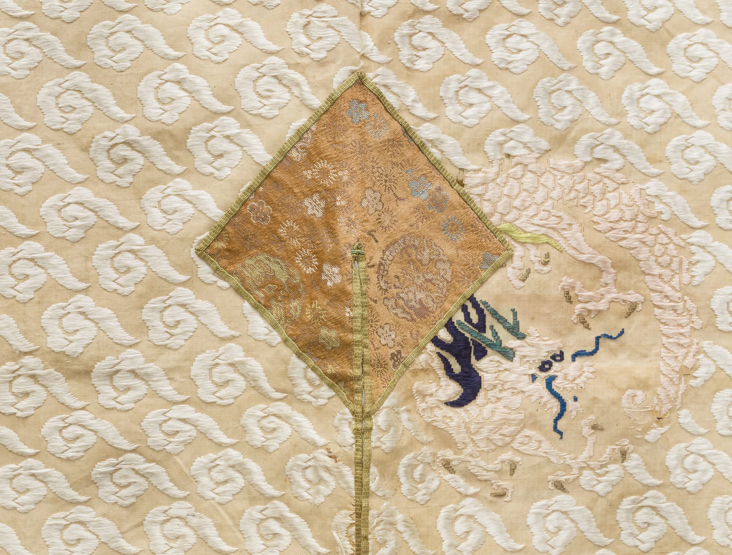 - Silk twill with silk and gilt-paper supplementary weft patterning, silk satin with silk and gilt-paper supplementary weft patterning appliqué, silk plain weave with gilt-paper-wrapped weft trim, wool plain weave, full finish